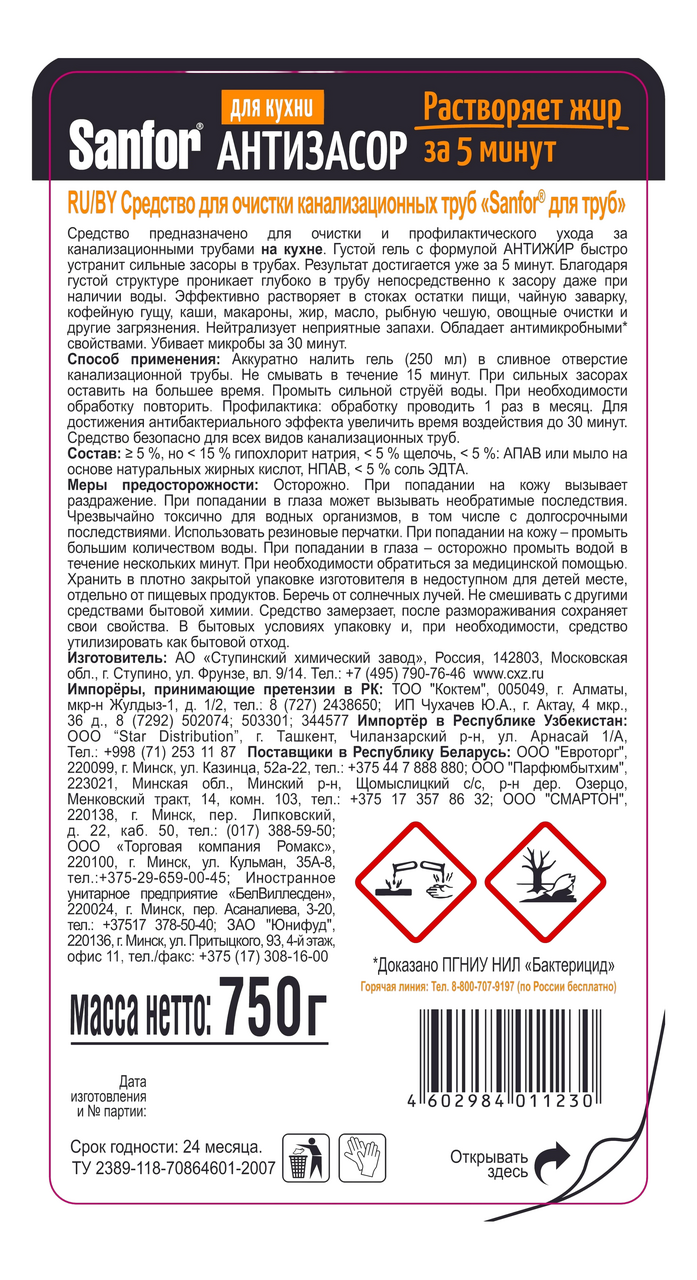 Гель для прочистки труб SANFOR Антизасор 750мл 5 мин. для кухни