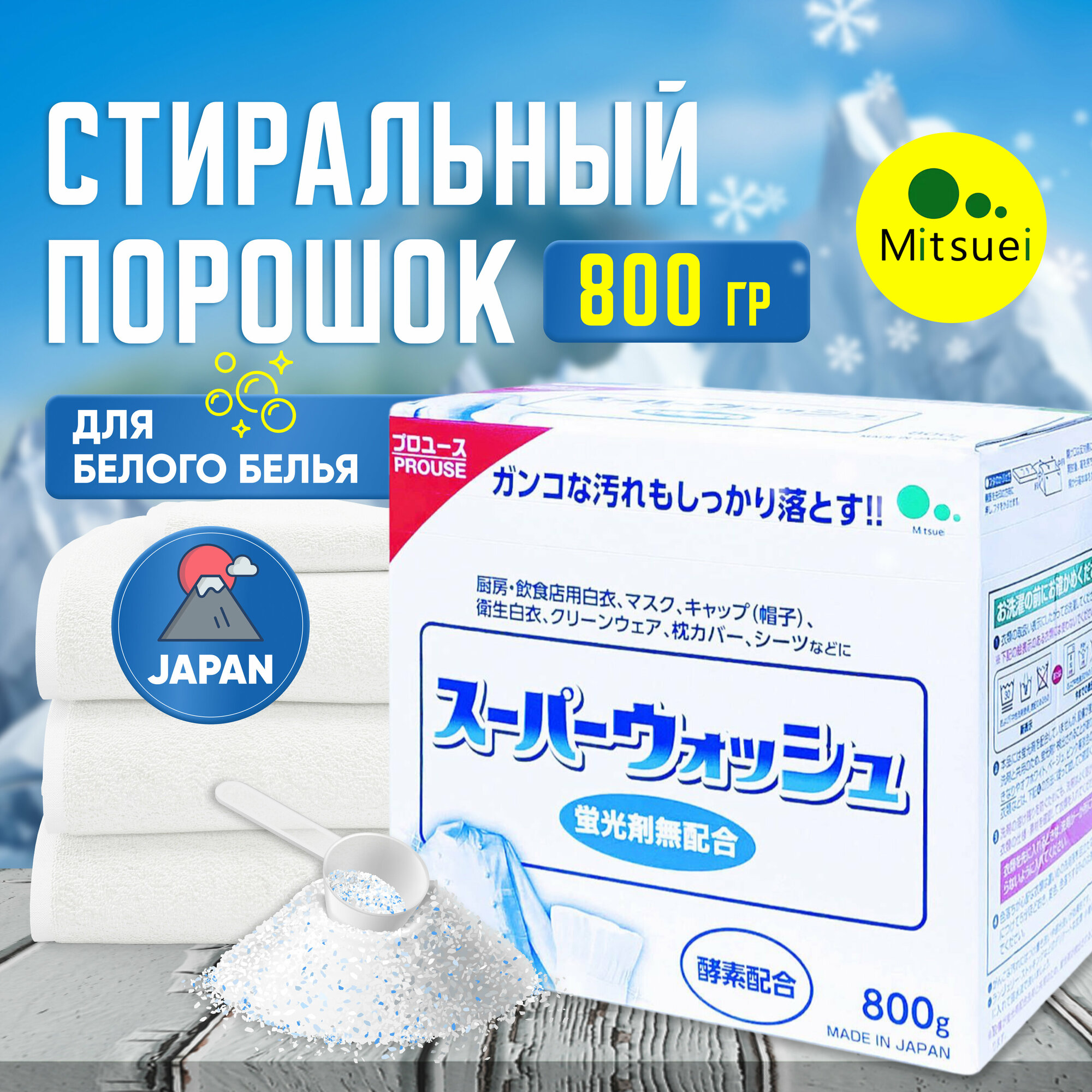 Стиральный порошок Mitsuei, Мощный отбеливающий порошок стиральный автомат "Super Wash" 800 гр. для стирки белого белья с ферментами,автомат Япония