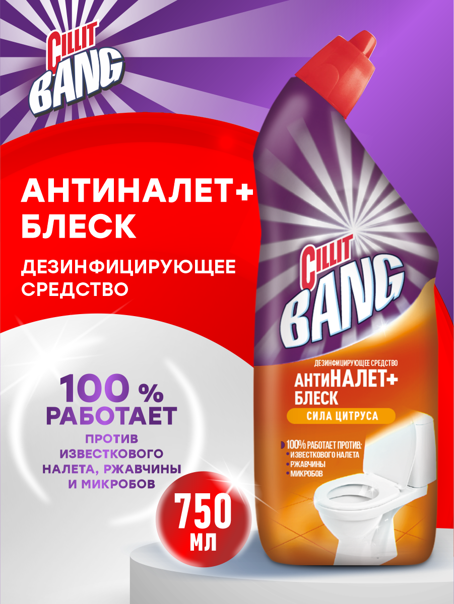 Средство для унитаза Cillit Bang, Анти - налет + Блеск, Сила цитруса, 750 мл, дезинфицирующее, 8149770