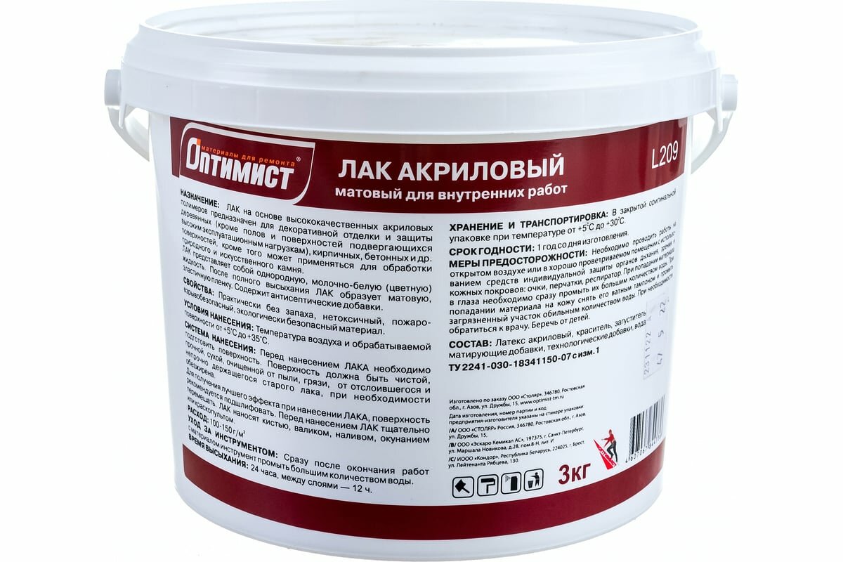 Купить Лак Оптимист L209 акриловый матовый для внутренних работ 3кг