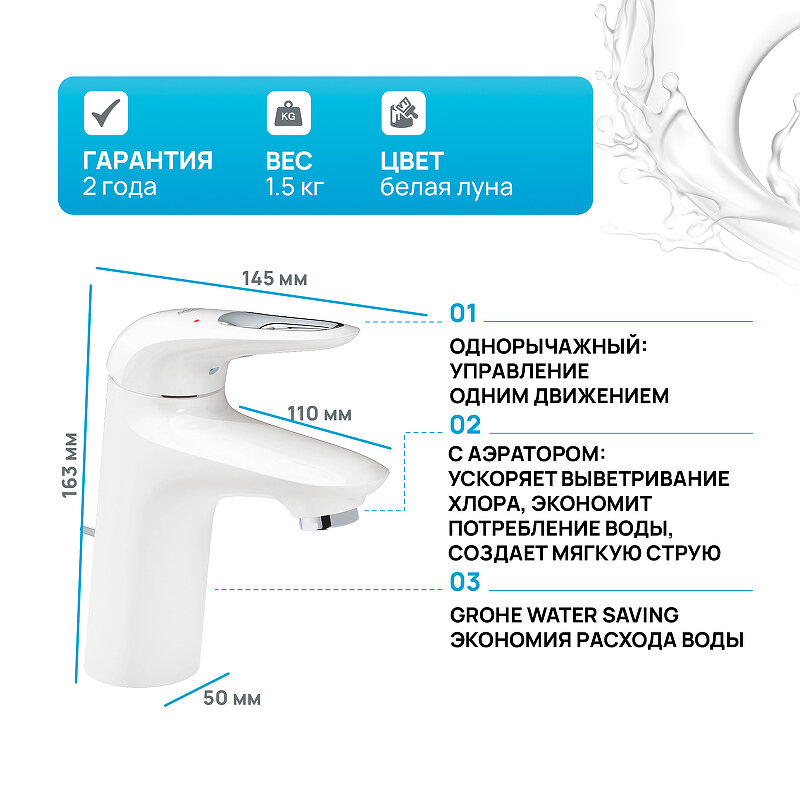 Смеситель для раковины Grohe Eurostyle, белый, с донным клапаном, артикул 33558LS3
