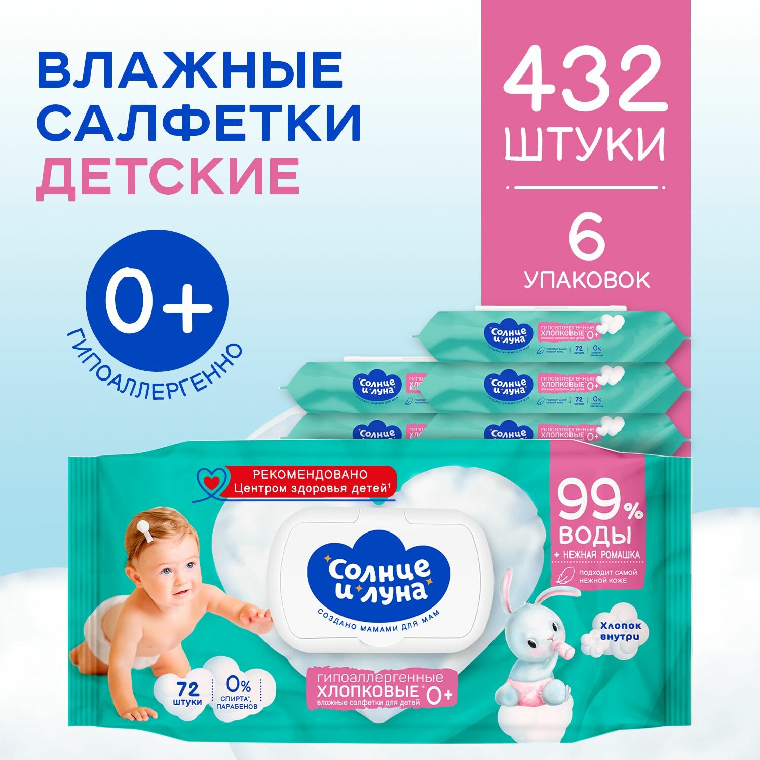 Купить Влажные салфетки детские Ромашка и хлопковое молочко 432 шт (72 шт х 6), солнце И луна