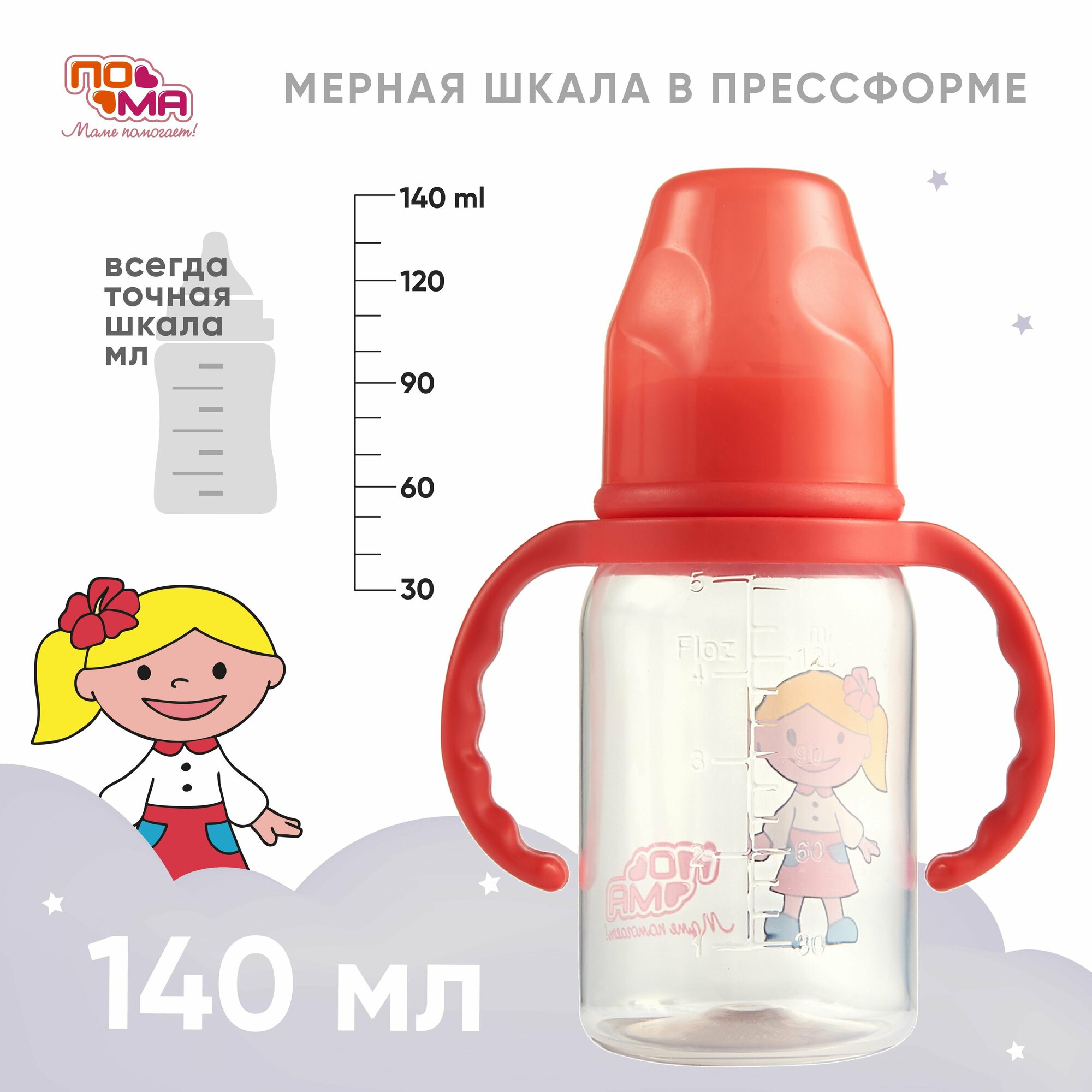Пома Бутылочка 140 мл.,Красная, с ручками, 1шт. (ПП, силикон, средний поток) 4+/12