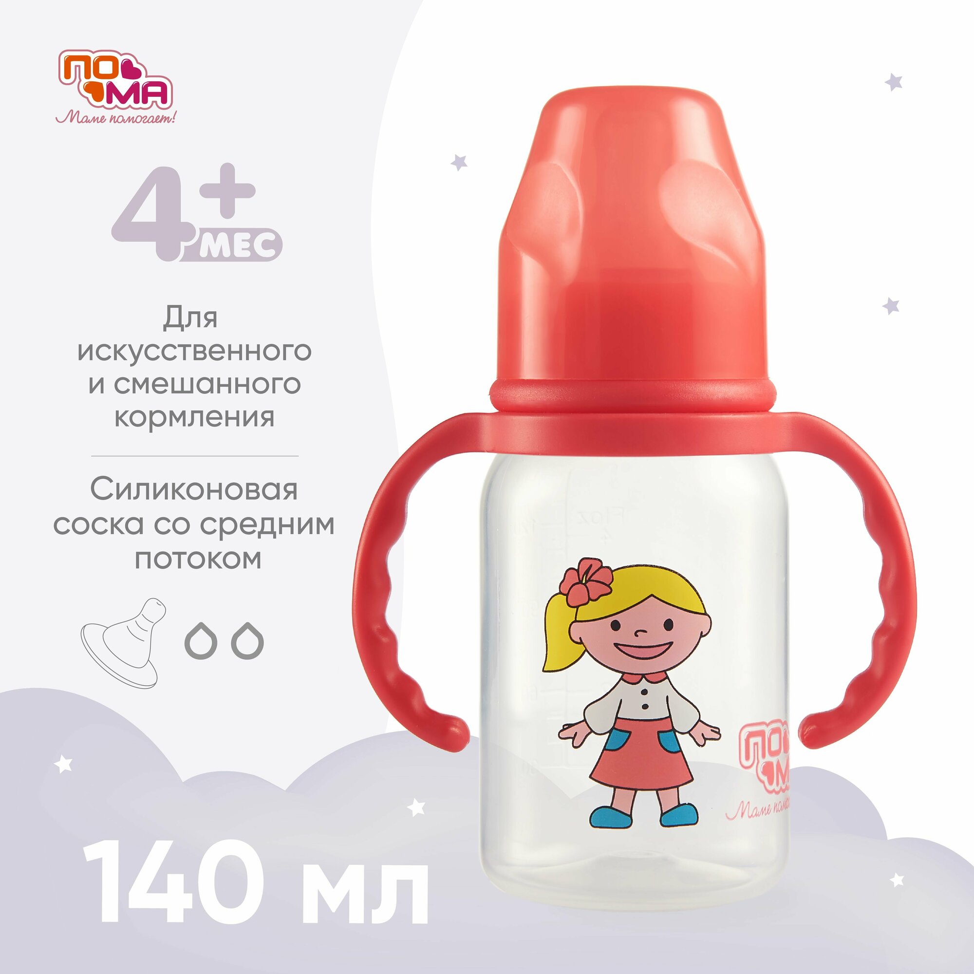 Бутылочка пома 140 мл с ручками с силиконовой соской со средним потоком, 4+, красная