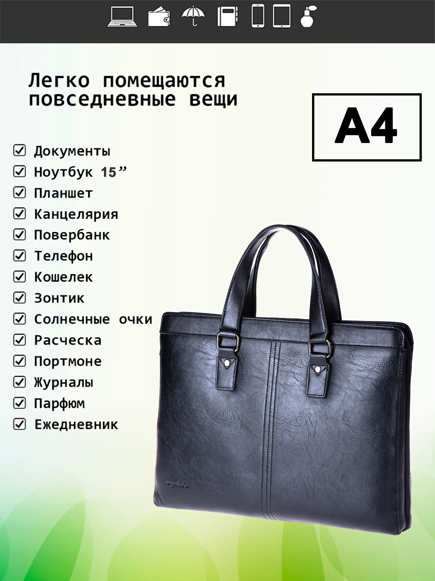 | Особенности модели | вмещает А4, внешний карман, внутренний карман, водонепроницаемая, плечевой ремень, съемный ремень |