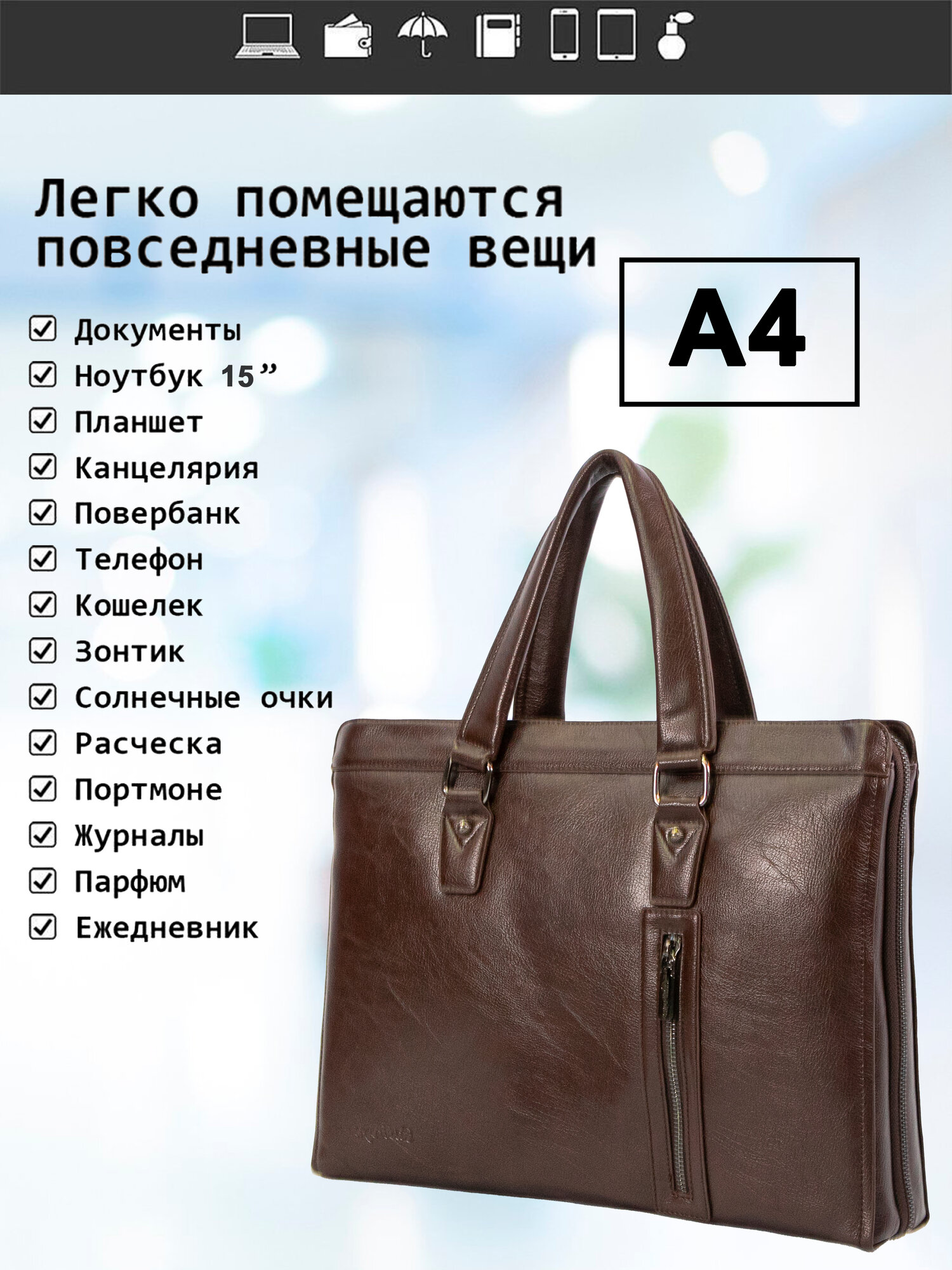 | Особенности модели | вмещает А4, внешний карман, внутренний карман, водонепроницаемая, плечевой ремень, съемный ремень |
