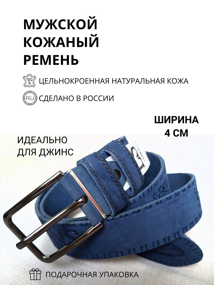 Ремень мужской кожаный для джинс синий, ширина 4 см, подарочная коробка, 105 см