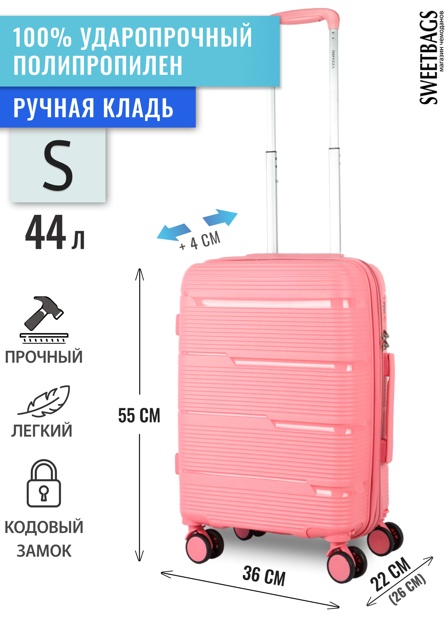 Купить Чемодан Sweetbags маленький (ручная кладь) из полипропилена с расширением на 4-х съемных колесах с кодовым замком (Orlean) розовый S