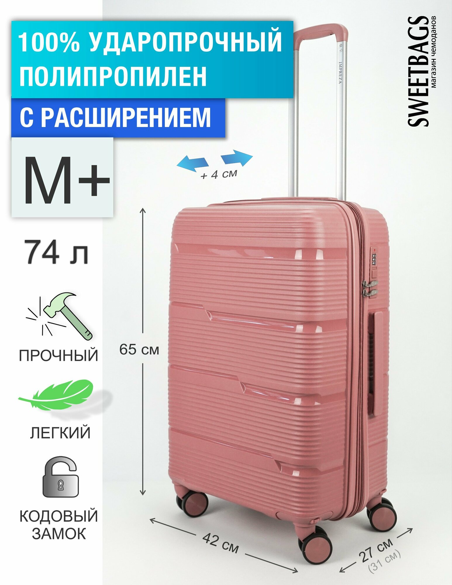 СохранитьЧемодан Sweetbags средний из полипропилена с расширением на 4-х съемных колесах с кодовым замком (Orlean) чайная роза M+ интересное: