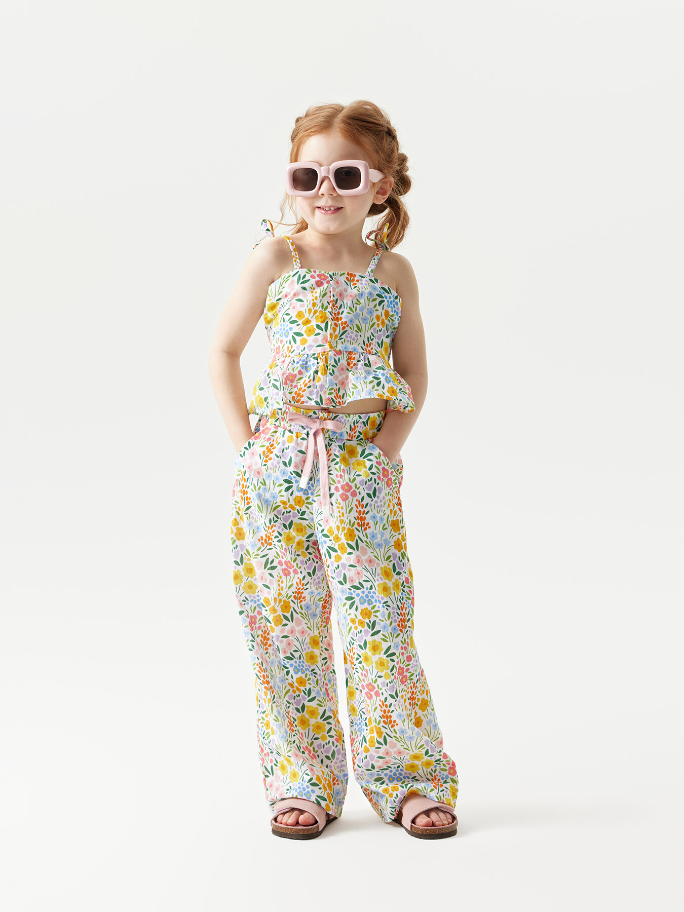 88190, Брюки детские Happy Baby, брюки летние хлопковые на завязках, одежда для девочки и мальчика, с цветами, размер 104-110