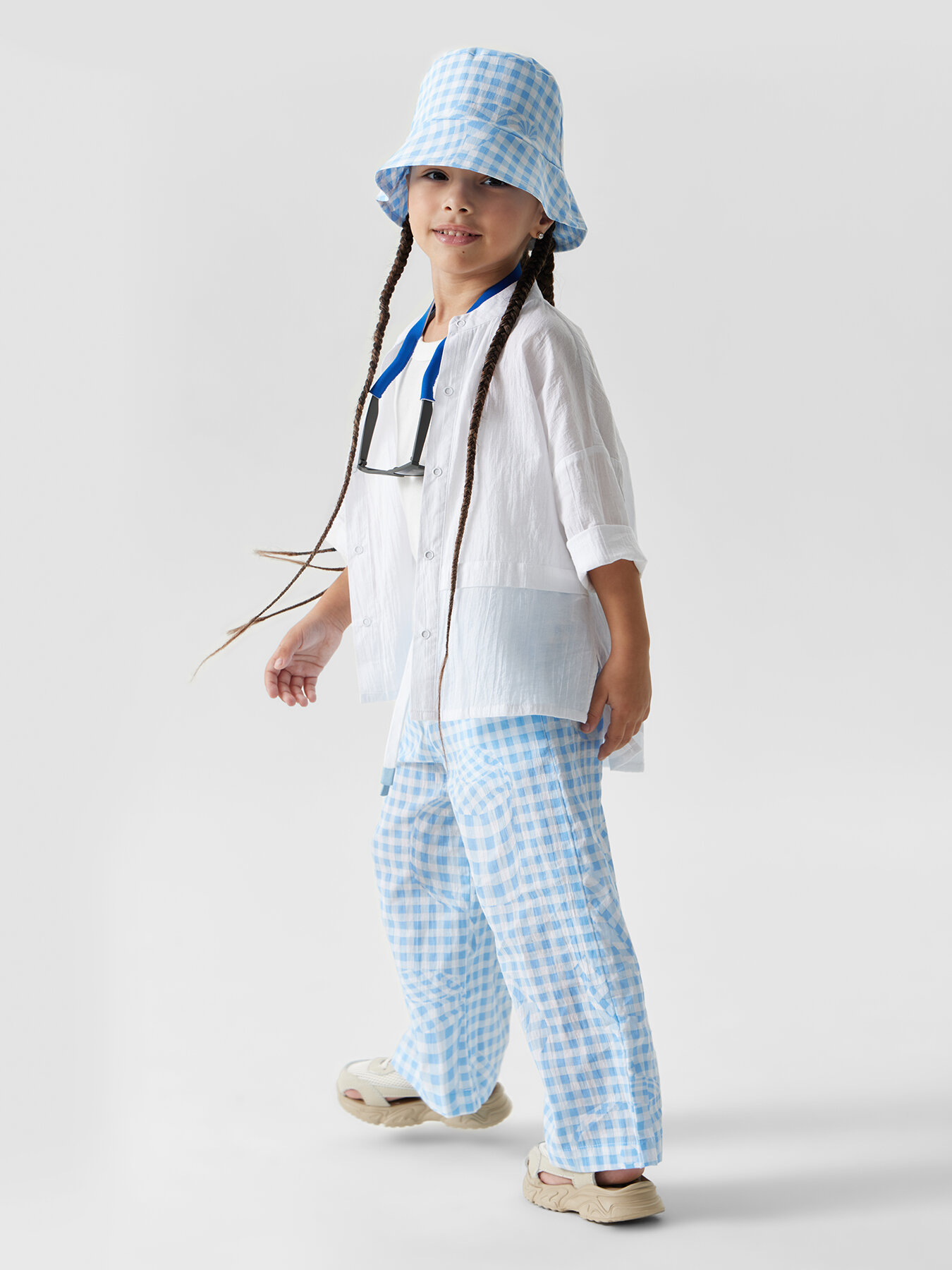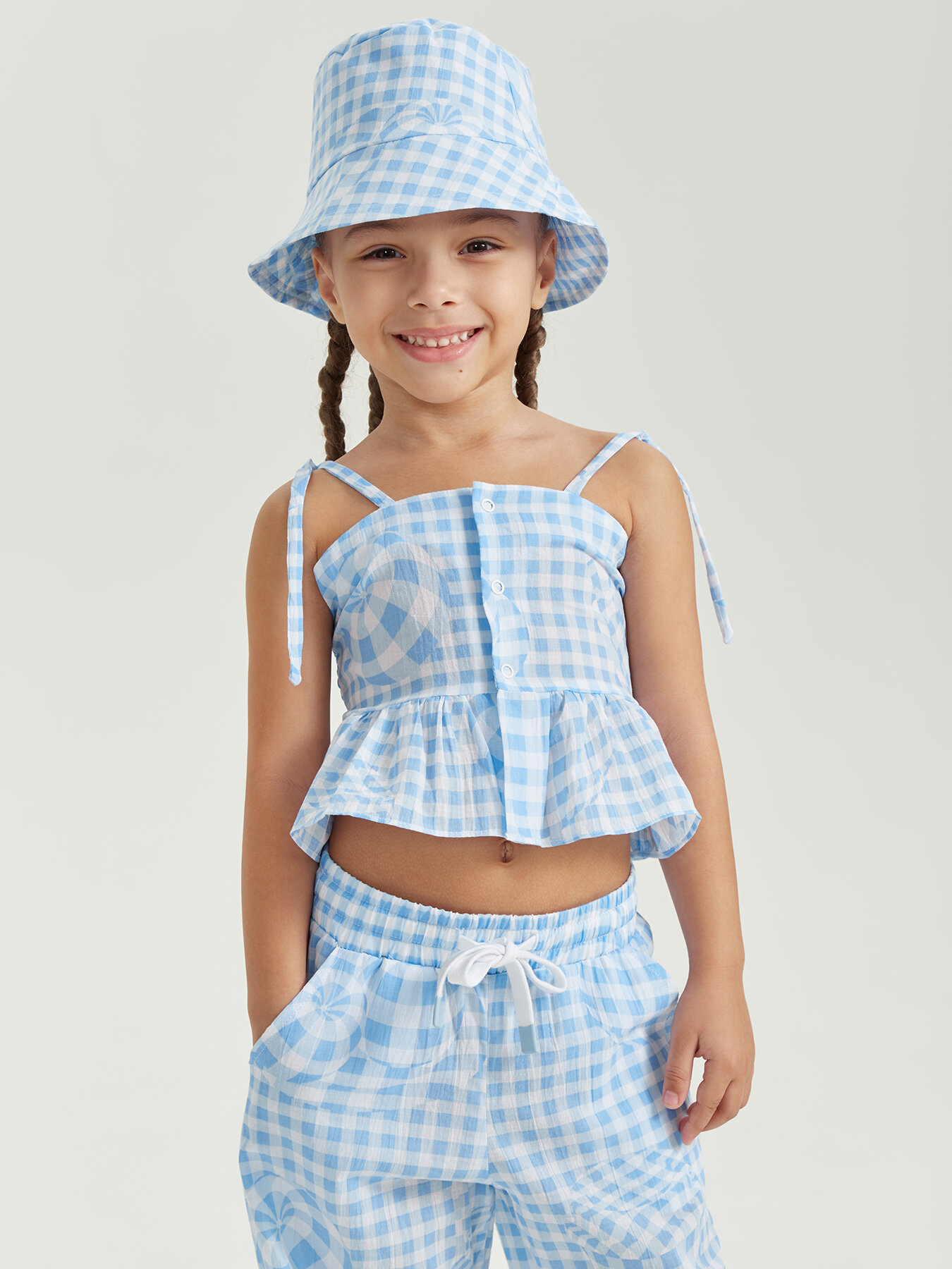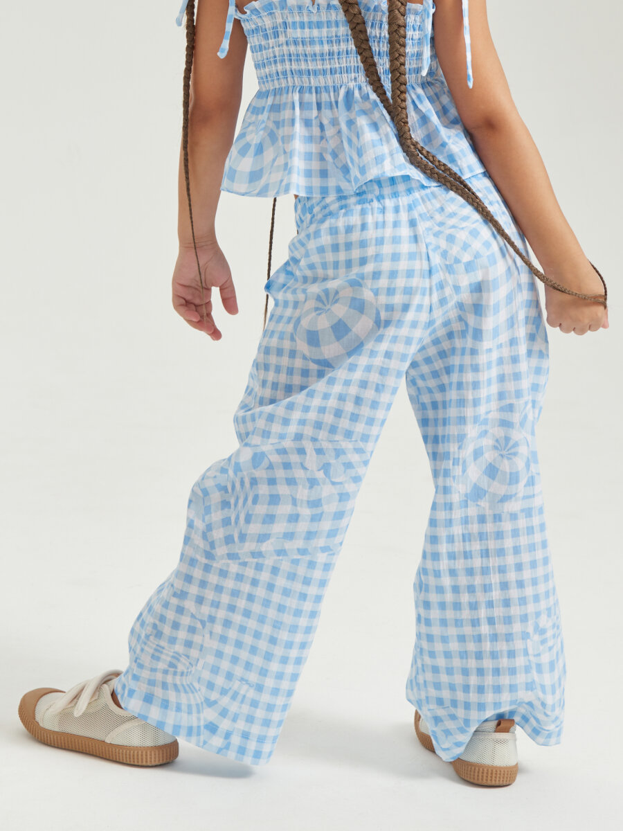 88190, Брюки детские Happy Baby, брюки летние хлопковые на завязках, одежда для девочки и мальчика, голубые в клетку, размер 104-110