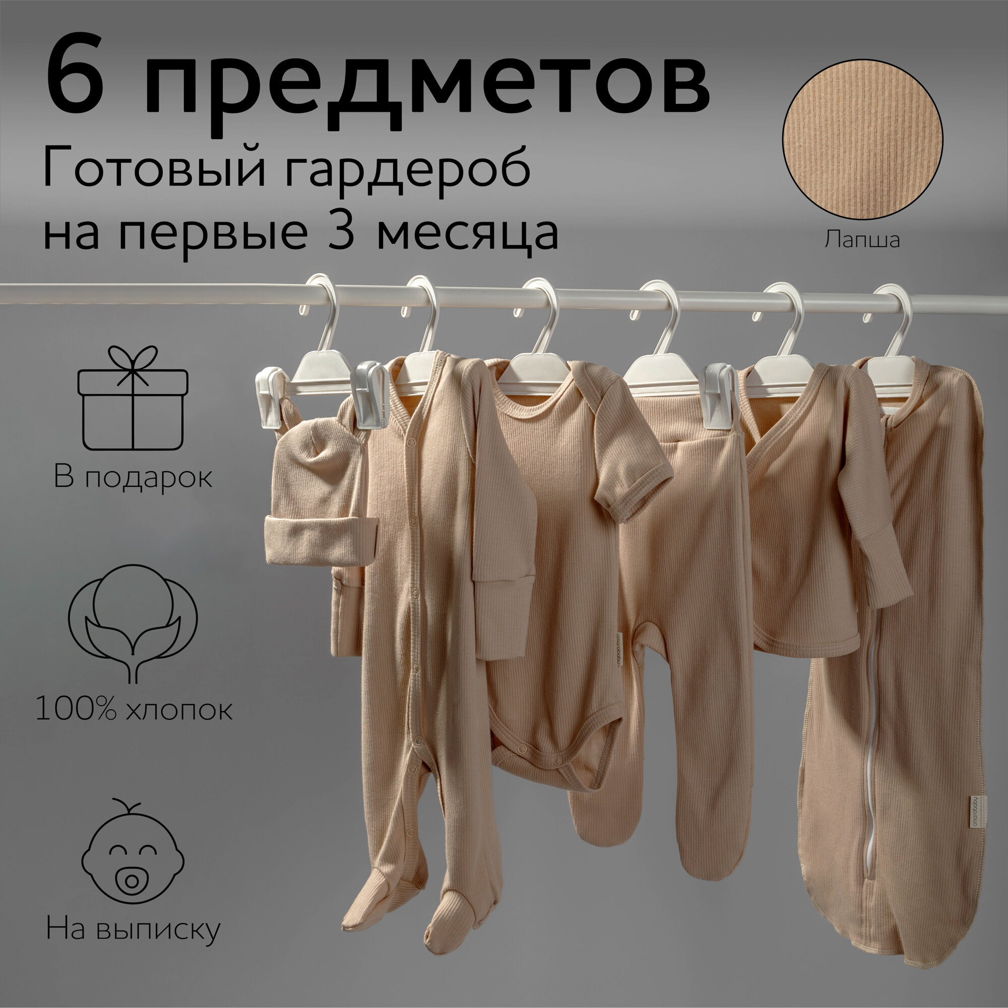 | Состав комплекта | боди, комбинезон, пеленка-кокон, ползунки, распашонка, чепчик |