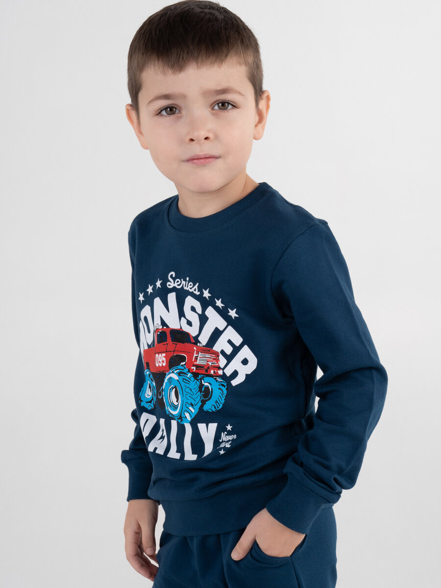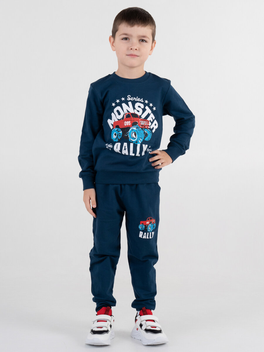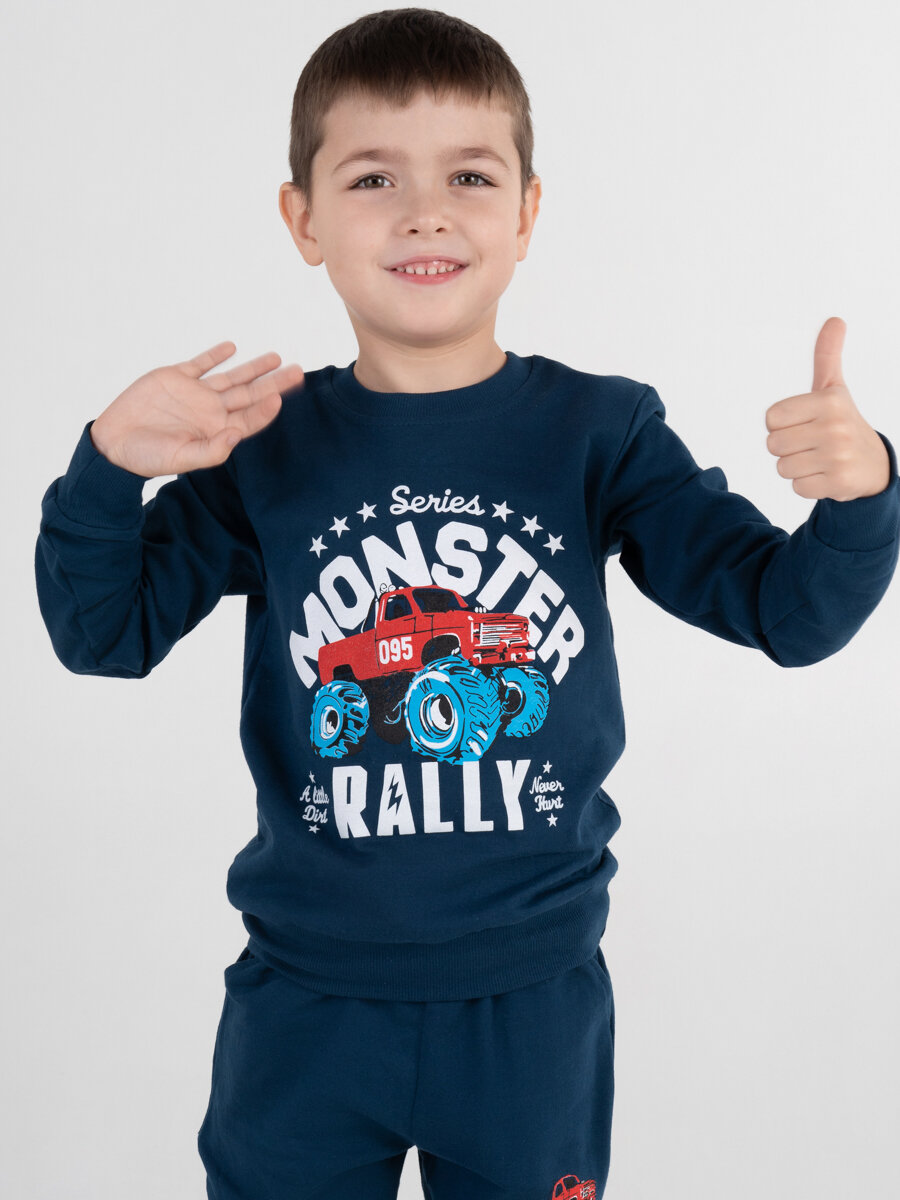Купить Спортивный костюм для мальчика "Monster Rally", рост 116, индиго, футер, без начеса, детский трикотаж, хлопок, худи, джоггеры, детский