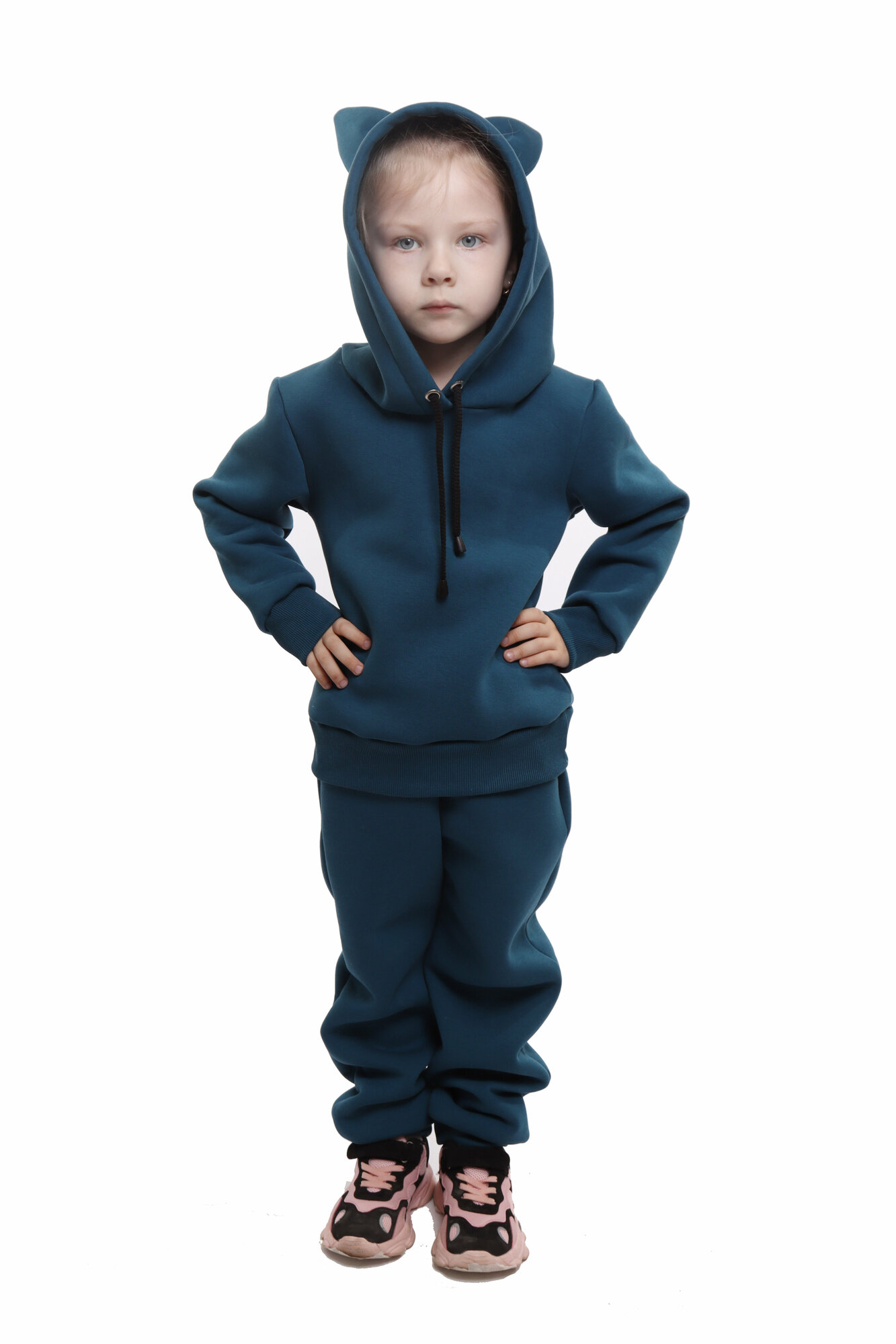 146-К2 Костюм детский утепленный, худи с капюшоном, с ушками и вышивкой Кот, цвет-петролиум, размер 116