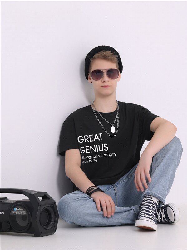 Купить Футболка для мальчика черная оверсайз с принтом Апрель 1ПДФК4518001/1311/599/*/3296/*/*/* черный,белый 84-164