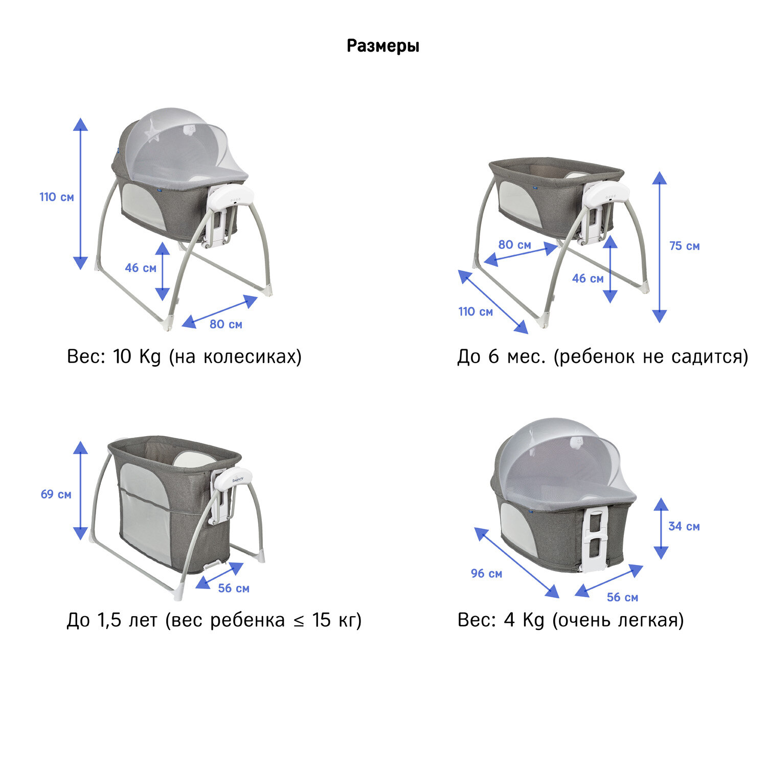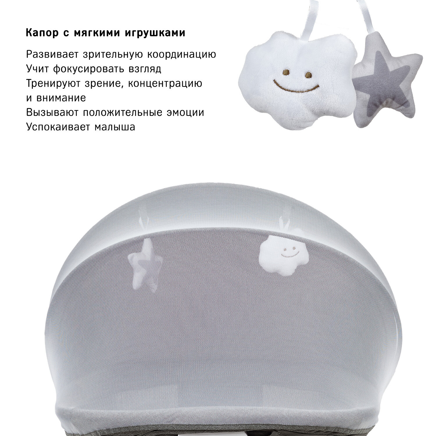 | Комплектация | колыбель / мобиль с детектором плача / съёмный матрасик / капор с москитной сеткой / 2 игрушки / адаптер / пульт д/у / прорезиненные ножки / колесики в двух опорах |