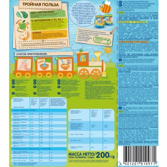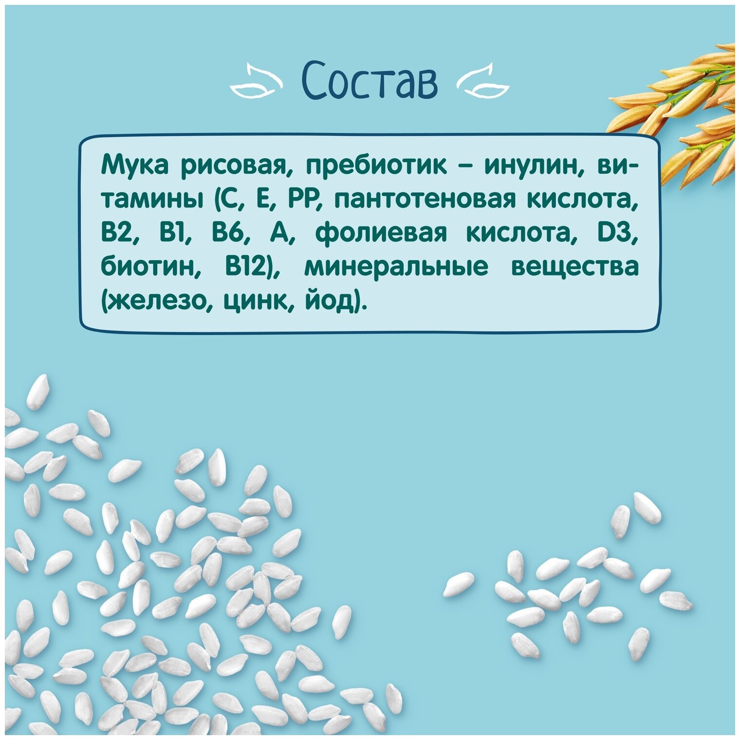 | Состав | мука рисовая / пребиотик-инулин / витамины (С / Е / РР / пантотеновая кислота / В2 / В1,В6 / А / фолиевая кислота / D3 / биотин / В12) / минеральные вещества (железо / цинк / йод) |