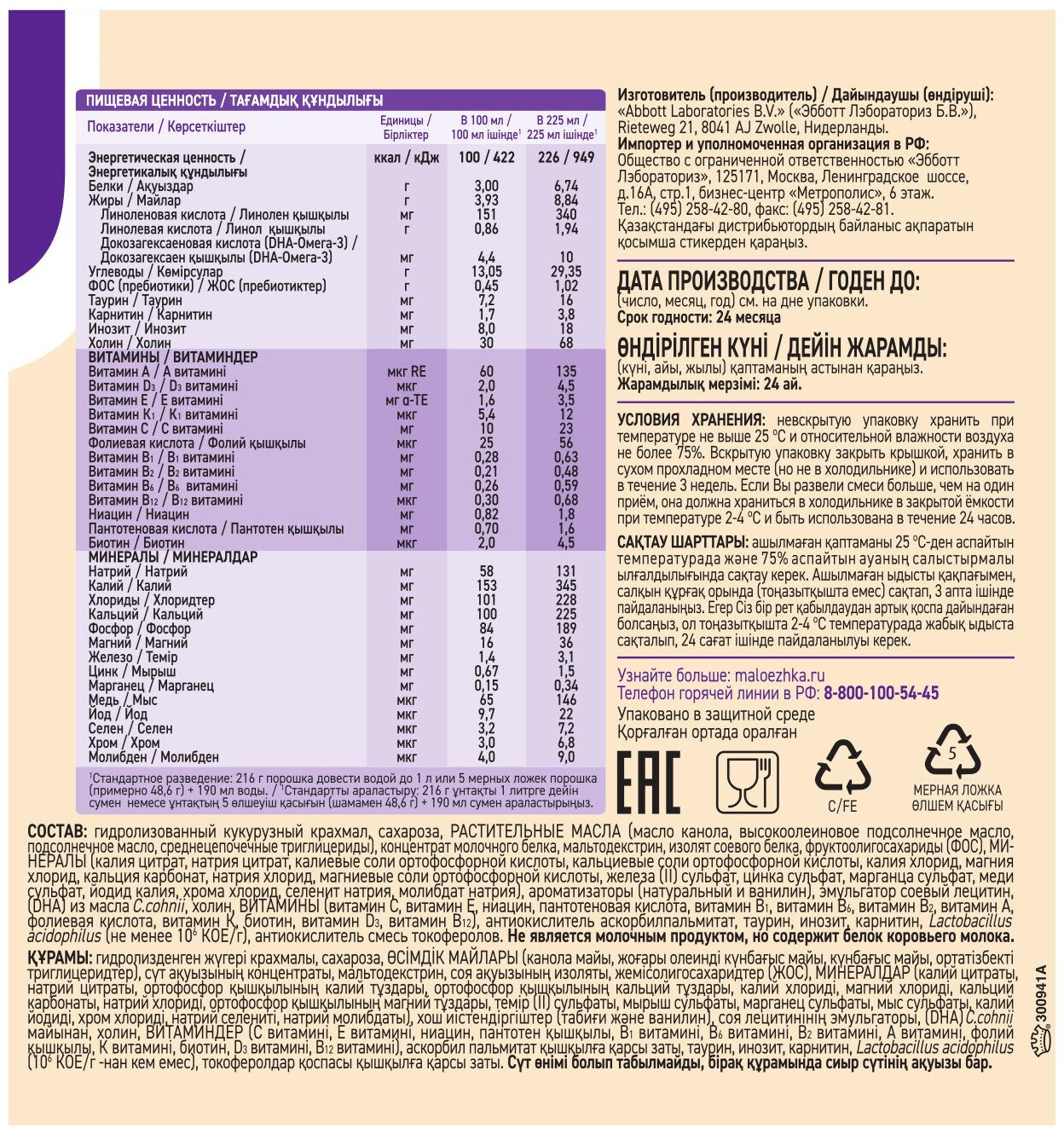 | Состав | гидролизованный кукурузный крахмал / сахароза / РАСТИТЕЛЬНЫЕ МАСЛА (масло канола / высокоолеиновое подсолнечное масло / подсолнечное масло / среднецепочечные триглицериды) / концентрат молочного белка / мальтодекстрин / изолят соевого белка / фруктоолигосахариды (ФОС) / минералы (калия цитрат / натрия цитрат / калиевые соли ортофосфорной кислоты / кальциевые соли ортофосфорной кислоты / калия хлорид / магния хлорид / кальция карбонат / натрия хлорид / магниевые соли ортофосфорной кислоты / железа (II) сульфат / цинка сульфат / марганца сульфат / меди сульфат / йодид калия / хрома хлорид / селенит натрия / молибдат натрия) / ароматизаторы (натуральный и ванилин) / эмульгатор соевый лецитин / (dha) из масла c.cohnii / холин / ВИТАМИНЫ (витамин С / витамин е / ниацин / пантотеновая кислота / витамин В1 / витамин В6 / витамин В2 / витамин А / фолиевая кислота / витамин К / биотин / витамин D3 / витамин в12) / антиокислитель аскорбилпальмитат / таурин / инозит / карнитин / lactobacillus acidophilus (не менее 106 кое/г) / антиокислитель смесь токоферолов |