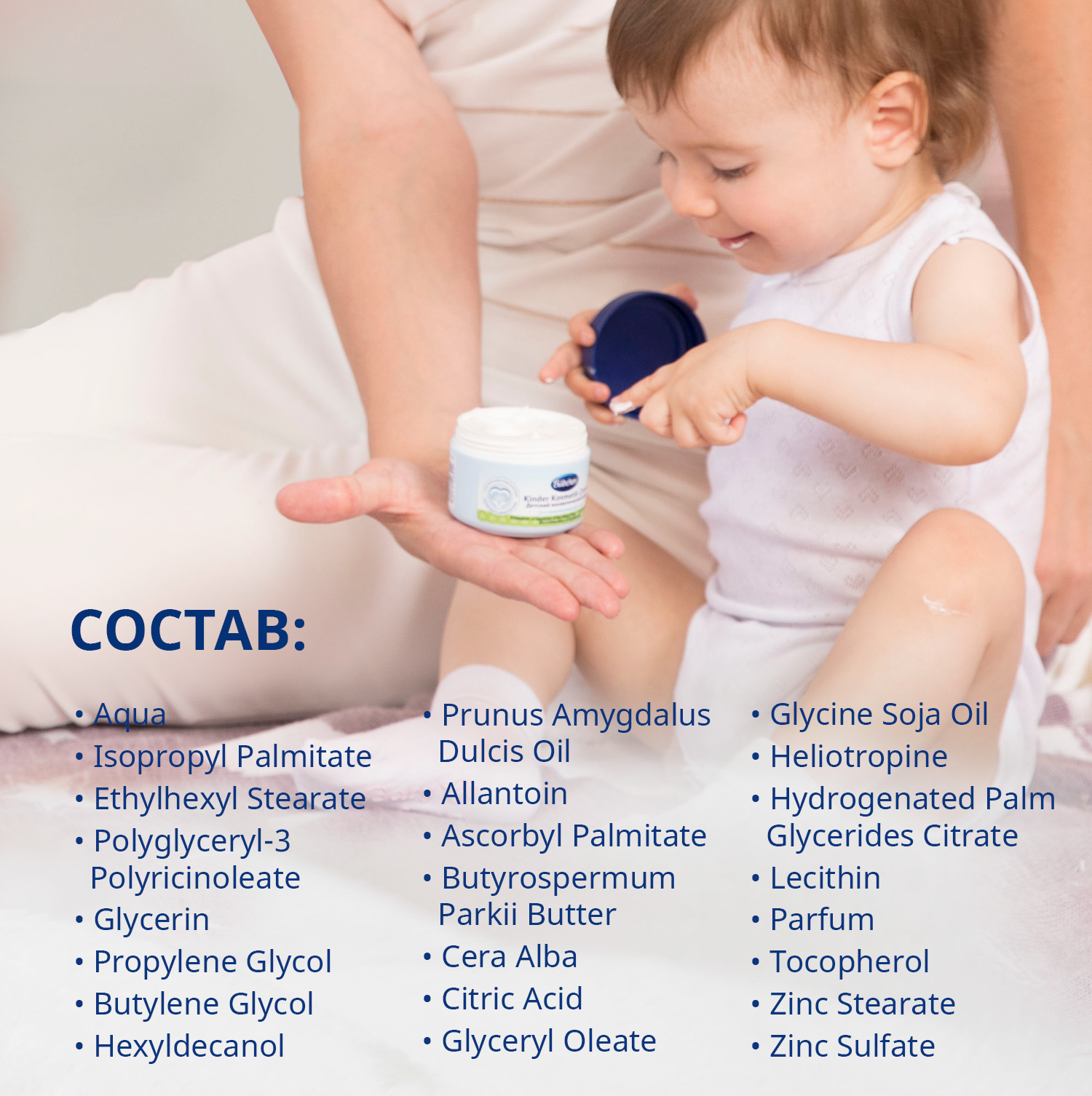 | Состав | Aqua, Isopropyl Palmitate, Ethylhexyl Stearate, Polyglyceryl-3 Polyricinoleate, Glycerin, Propylene Glycol, Butylene Glycol, Hexyldecanol, Hexyldecyl Laurate, Panthenol, Prunus Amygdalus Dulcis Oil, Allantoin, Ascorbyl Palmitate, Butyrospermum Parkii Butter, Cera Alba, Citric Acid, Glyceryl Oleate, Glycine Soja Oil, Heliotropine, Hydrogenated Palm Glycerides Citrate, Lecithin, Parfum, Tocopherol, Zinc Stearate, Zinc Sulfate |