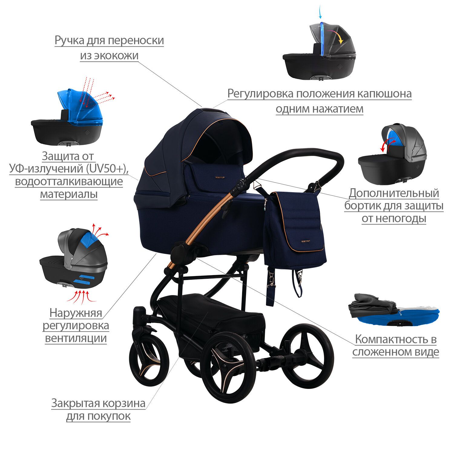 Детская коляска/2 в 1/Bebetto/Torino Si (экокожа+ткань)/SI01/рама золотая