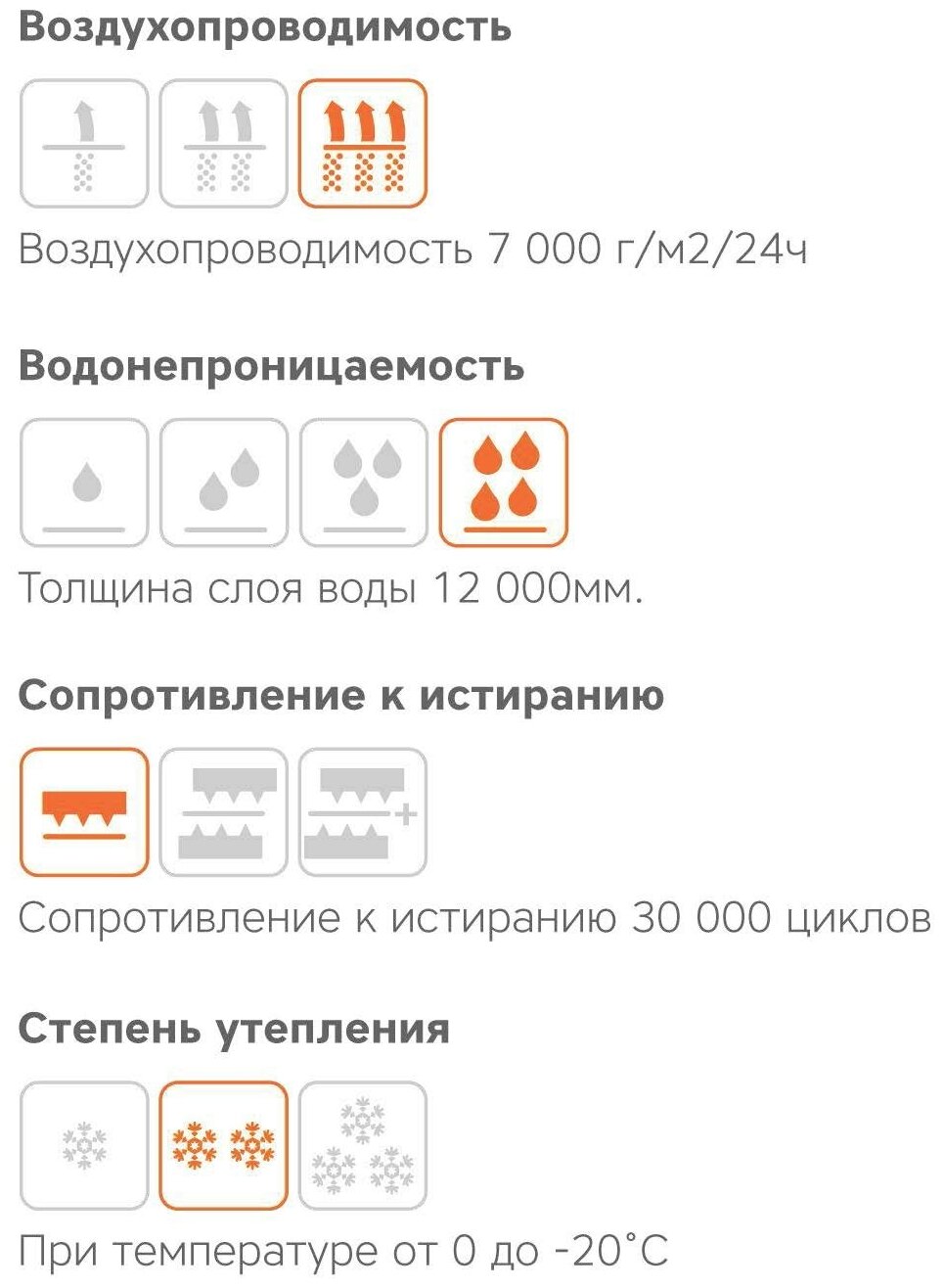 | Особенности модели | водонепроницаемая, защита от попадания снега, карманы, манжеты, регулировка размера, усиленные колени, утепленная |