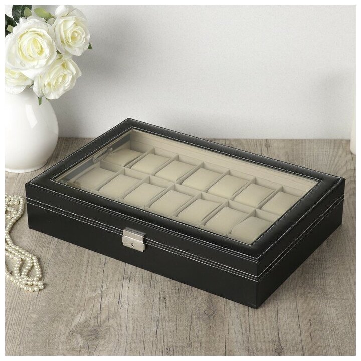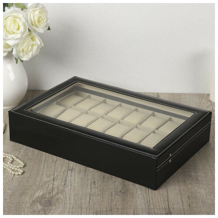 Купить Шкатулка кожзам под часы 24 отделения "Чёрная с белой строчкой" 8,5х43,5х29,5 см