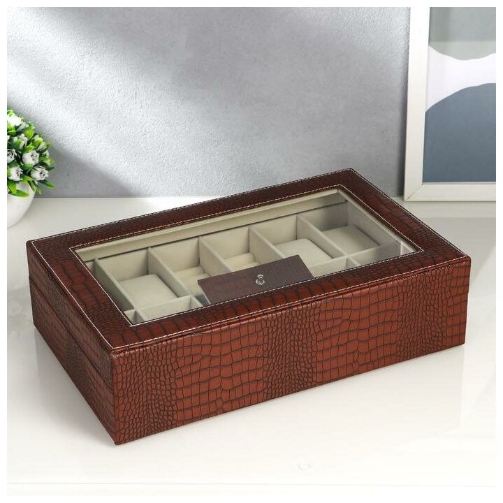 Купить Шкатулка кожзам под часы 8 отделений и бижутерию "Рептилия кофейная" матовая 9,5х33х20 см 3488457