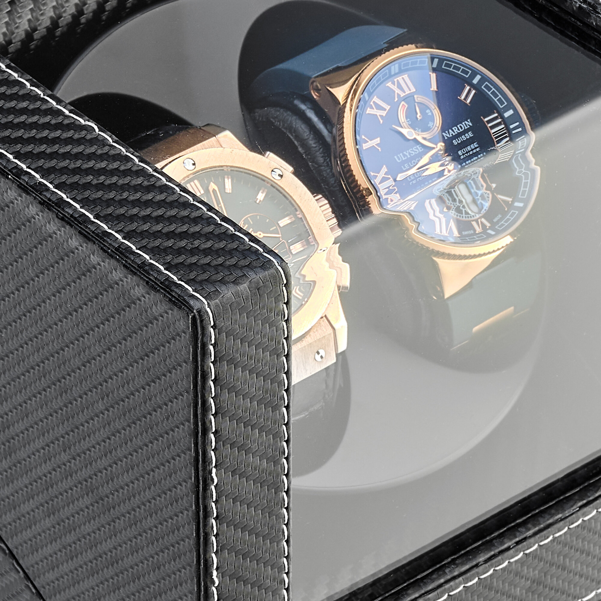 Шкатулка для хранения двух часов CloxBox YC-02BL, с белой прострочкой, стекло, черная