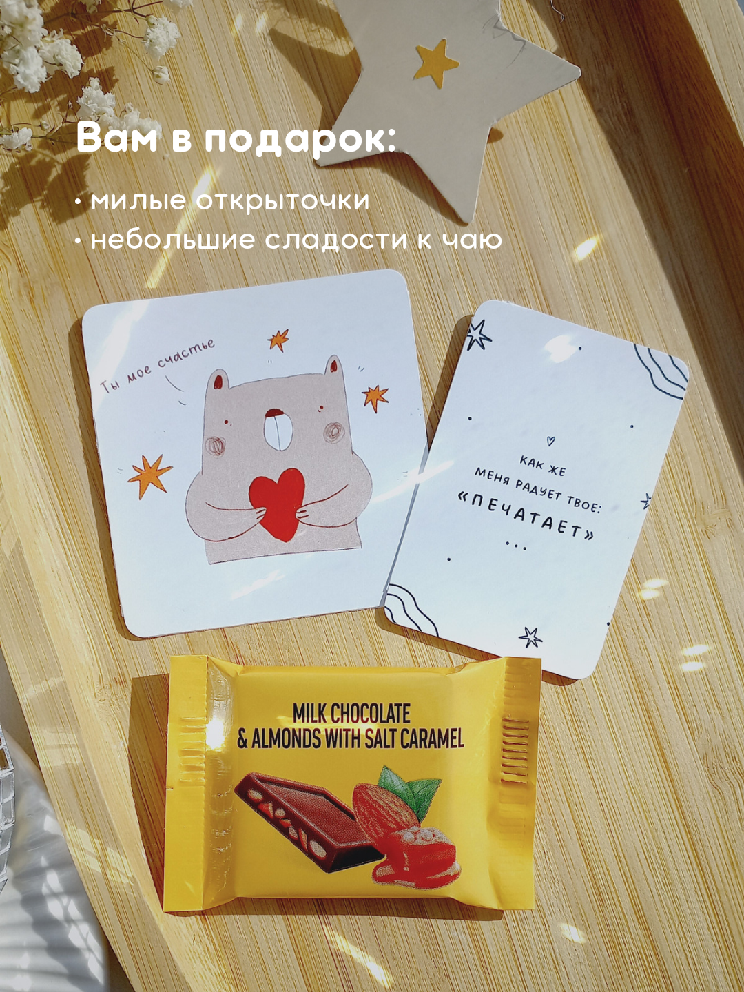 | Комплектация | 2 браслета, белая крафтовая упаковка, 2 мини открытки, милая наклейка, небольшие сладости |