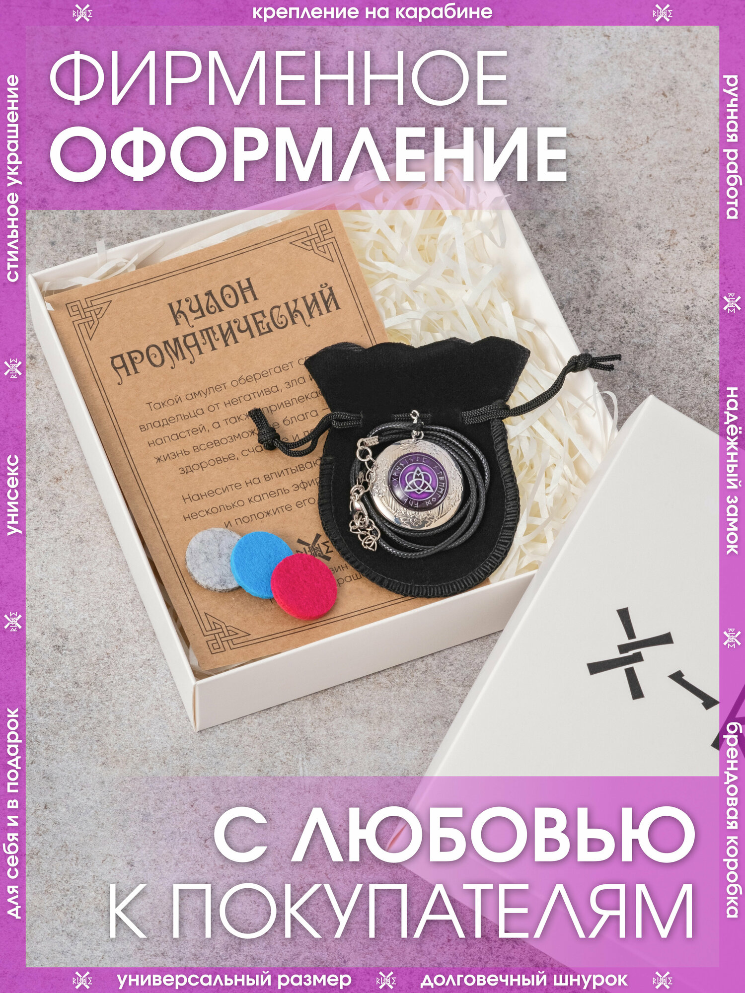 | Комплектация | Кулон – 1 шт., впитывающие диски – 3 шт., мешочек для хранения – 1 шт., аннотация – 1 шт., брендированная коробка X-Rune – 1 шт. |