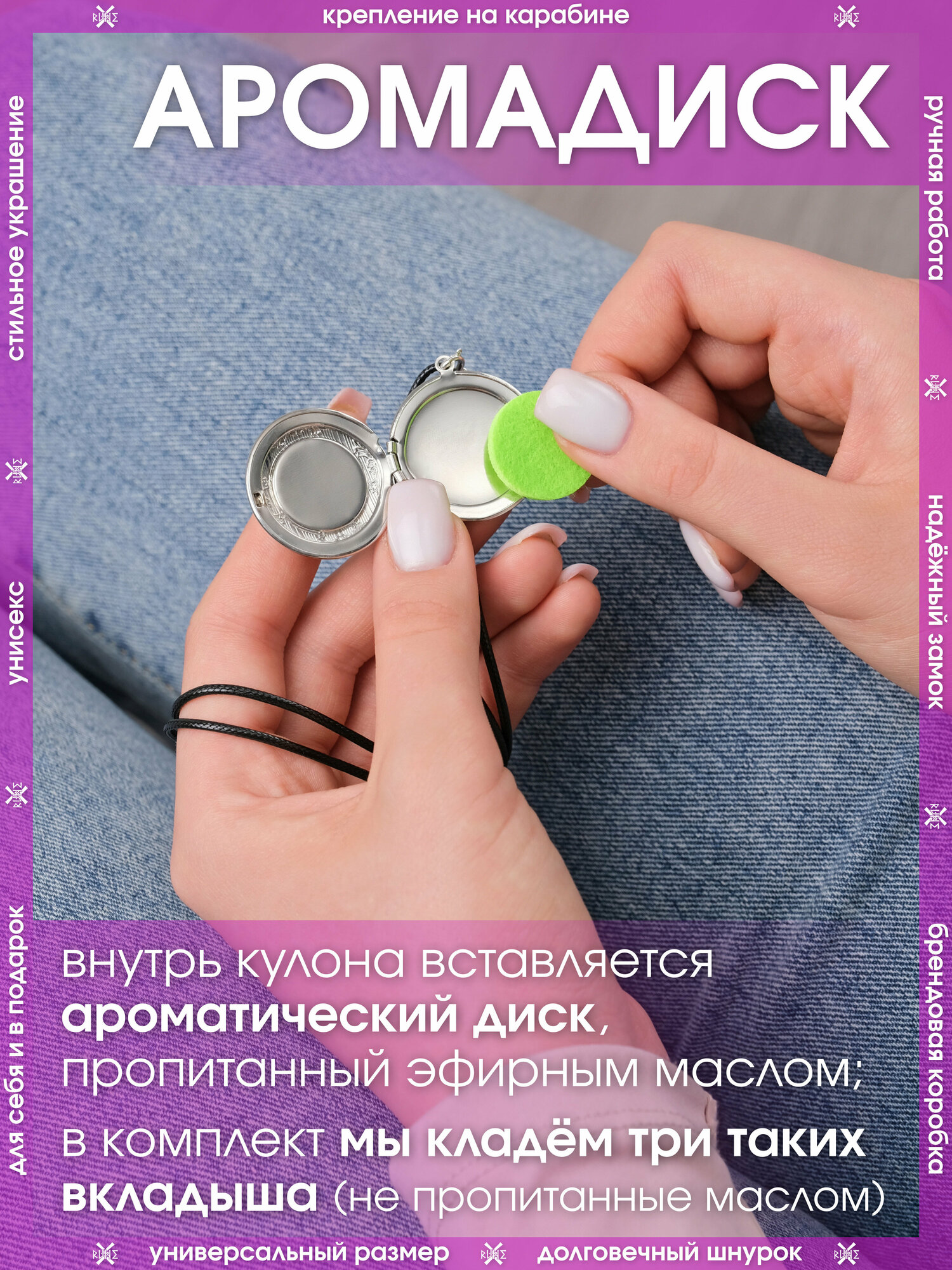 | Дополнительная информация | Для использования кулона в качестве ароматического – накапайте немного эфирного масла (не идёт в комплекте) на впитывающий диск (идёт в комплекте – 3 шт.) и положите внутрь кулона |