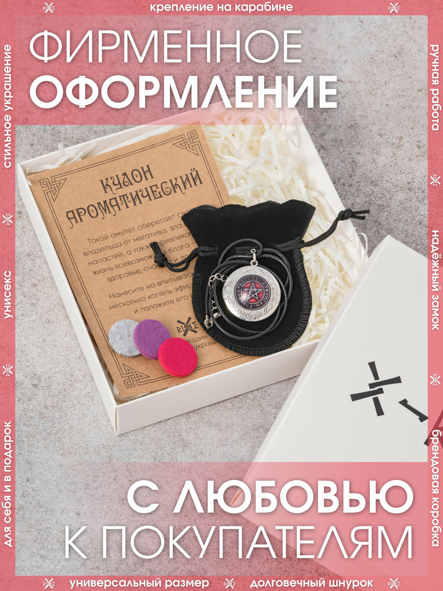 | Дополнительная информация | Для использования кулона в качестве ароматического – накапайте немного эфирного масла (не идёт в комплекте) на впитывающий диск (идёт в комплекте – 3 шт.) и положите внутрь кулона |