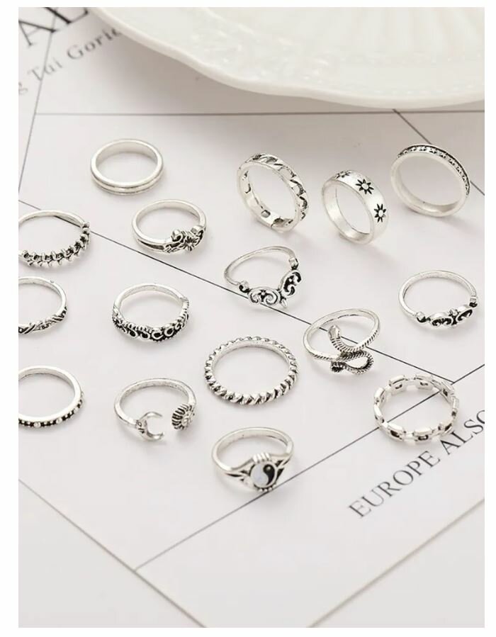 Набор колец в серебристом цвете, бижутерия, сет колец имитация серебра, 16 штук интересное: