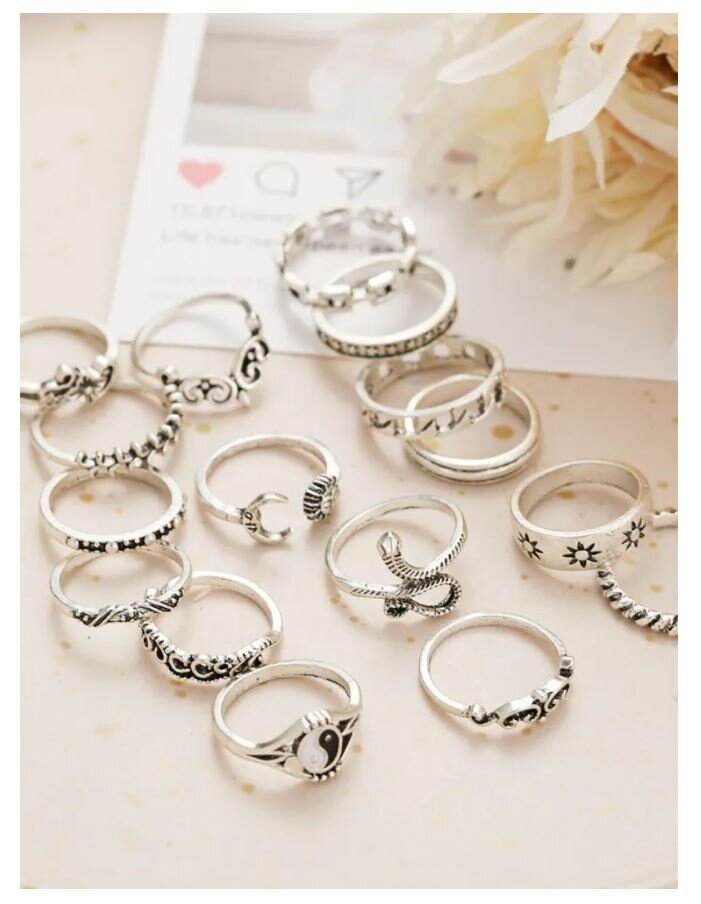 | Дополнительная информация | Набор колец в серебристом цвете, бижутерия, сет колец имитация серебра |