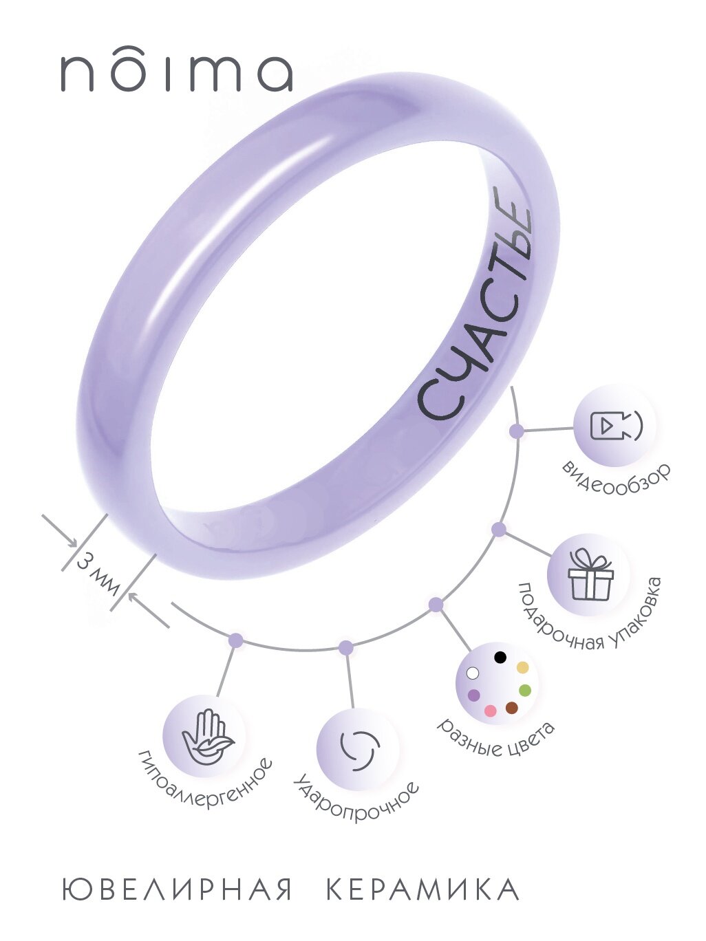 Кольцо керамическое "счастье" женское мужское фиолетовое 3мм 19 размер от NOIMA
