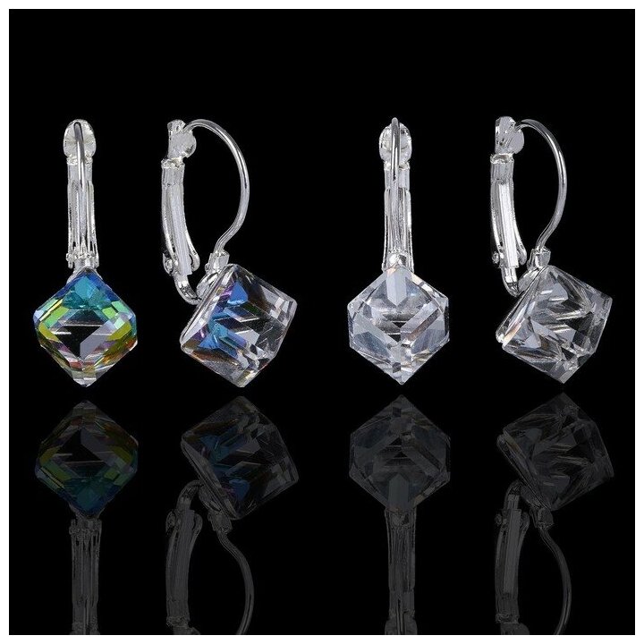 Серьги " Кубик", стекло, металл, цвет искристый в серебре 2,5*0,9см