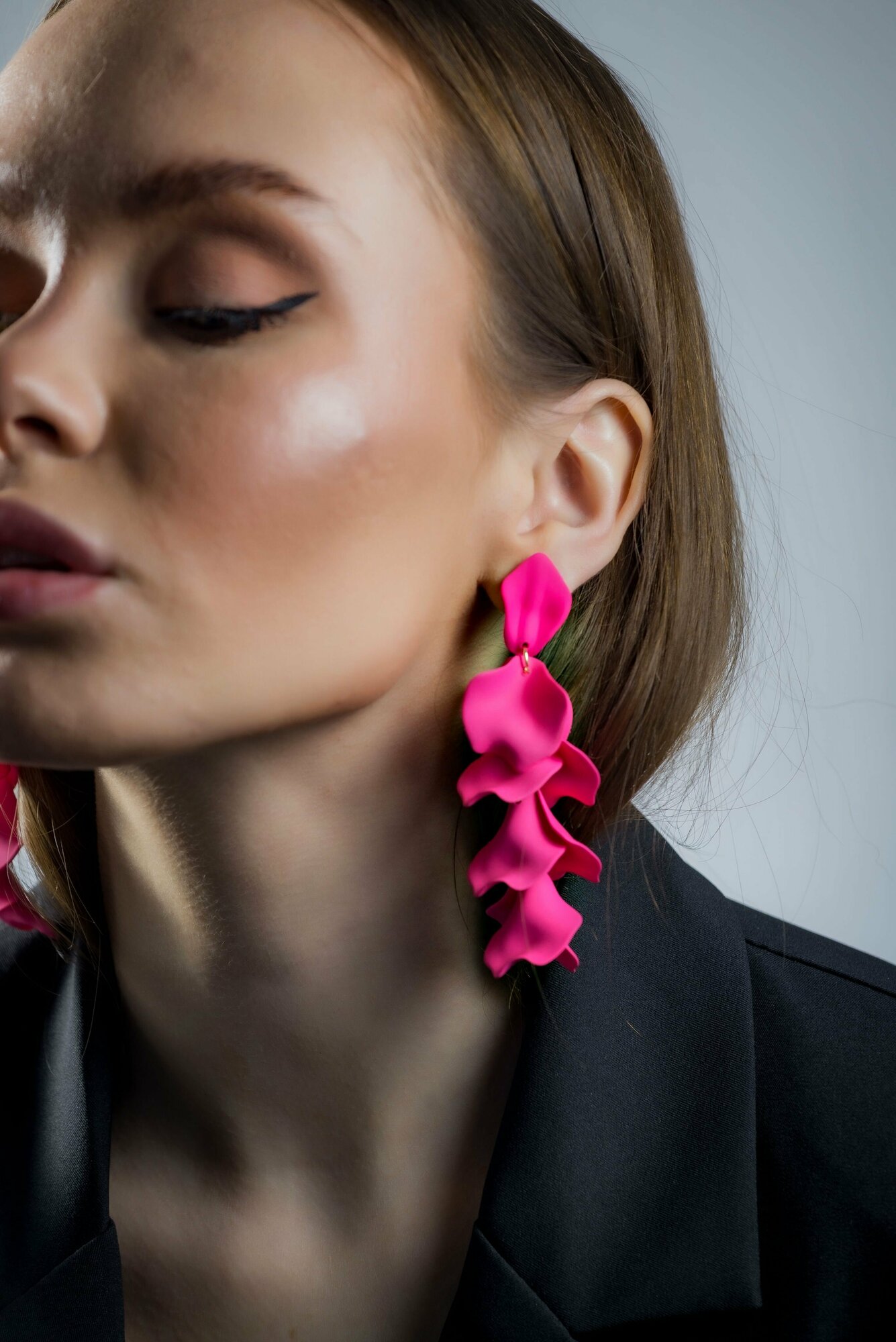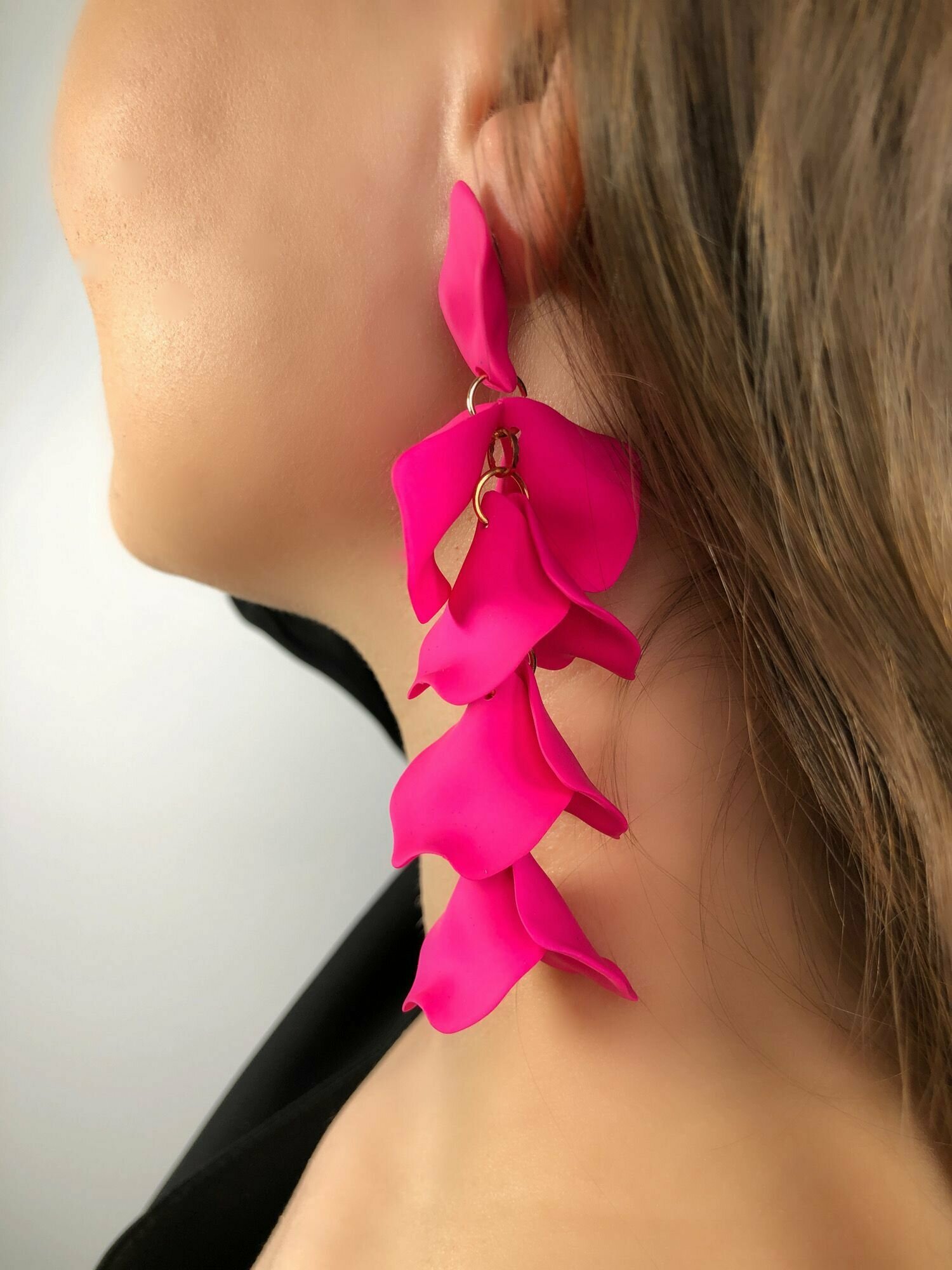Серьги длинные висячие вечерние женские стильные яркие фуксия сережки тренд 2024
