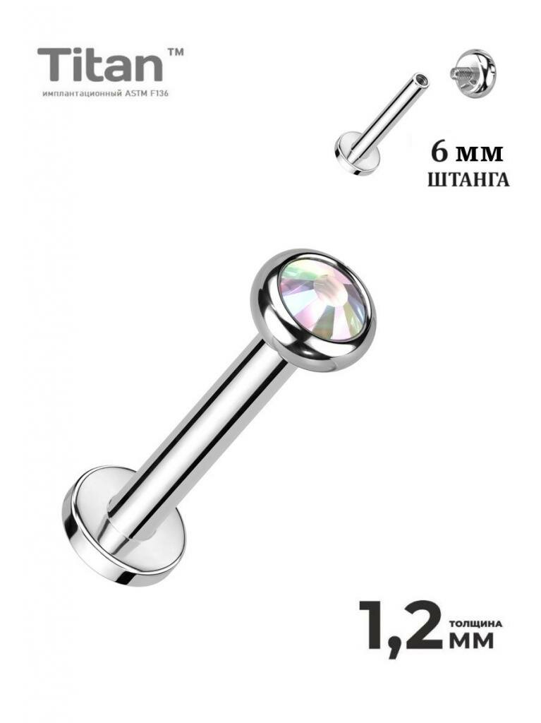 Титановая серьга лабрет с внутренней резьбой для пирсинга Монро, трагуса, хеликса/ 1.2*6 мм (кристалл: кубический цирконий)