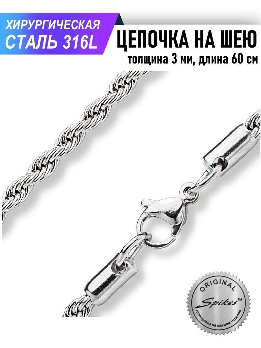 Цепочка на шею из стали Spikes , веревочное плетение лобстер. Толщина 3 мм, длина 600 мм