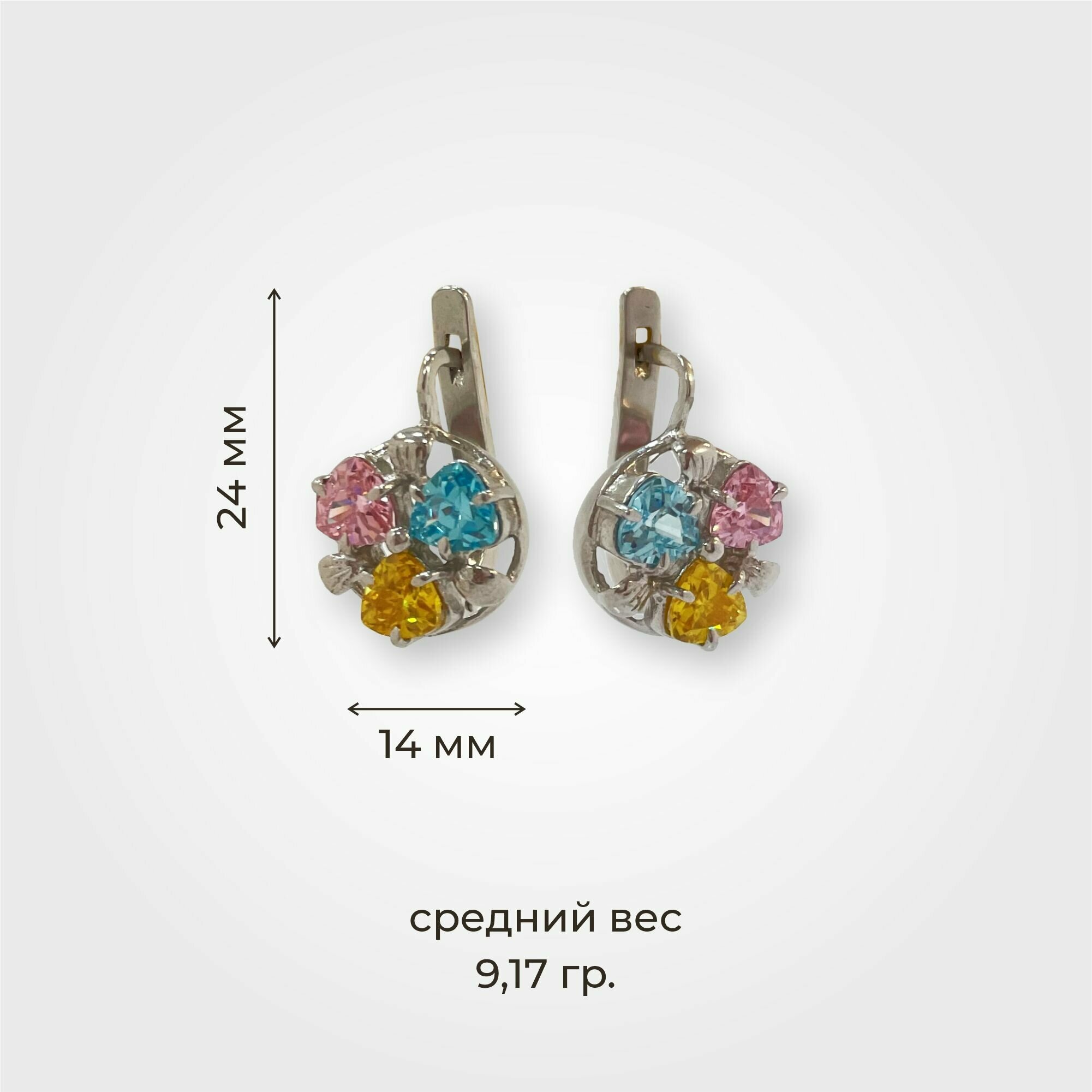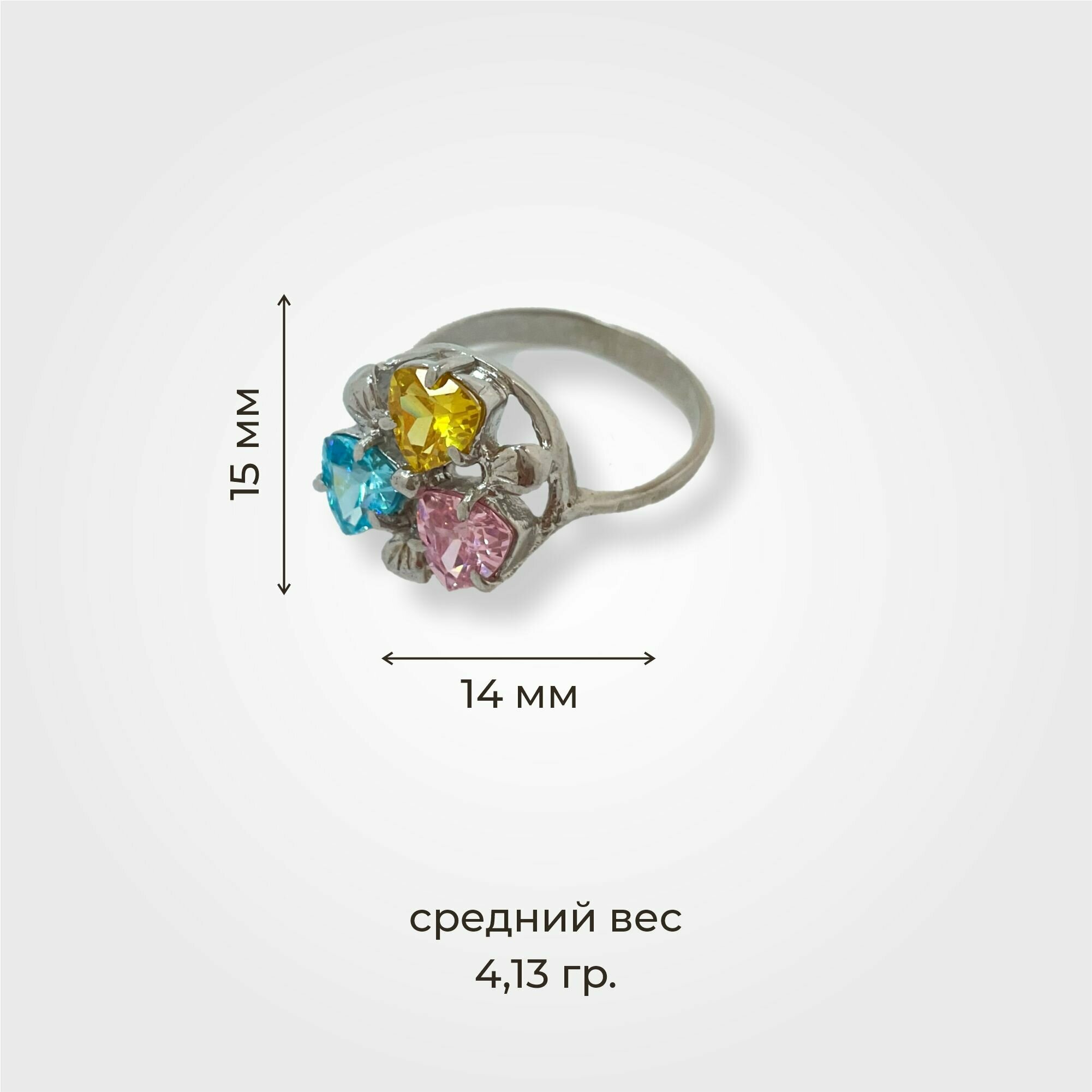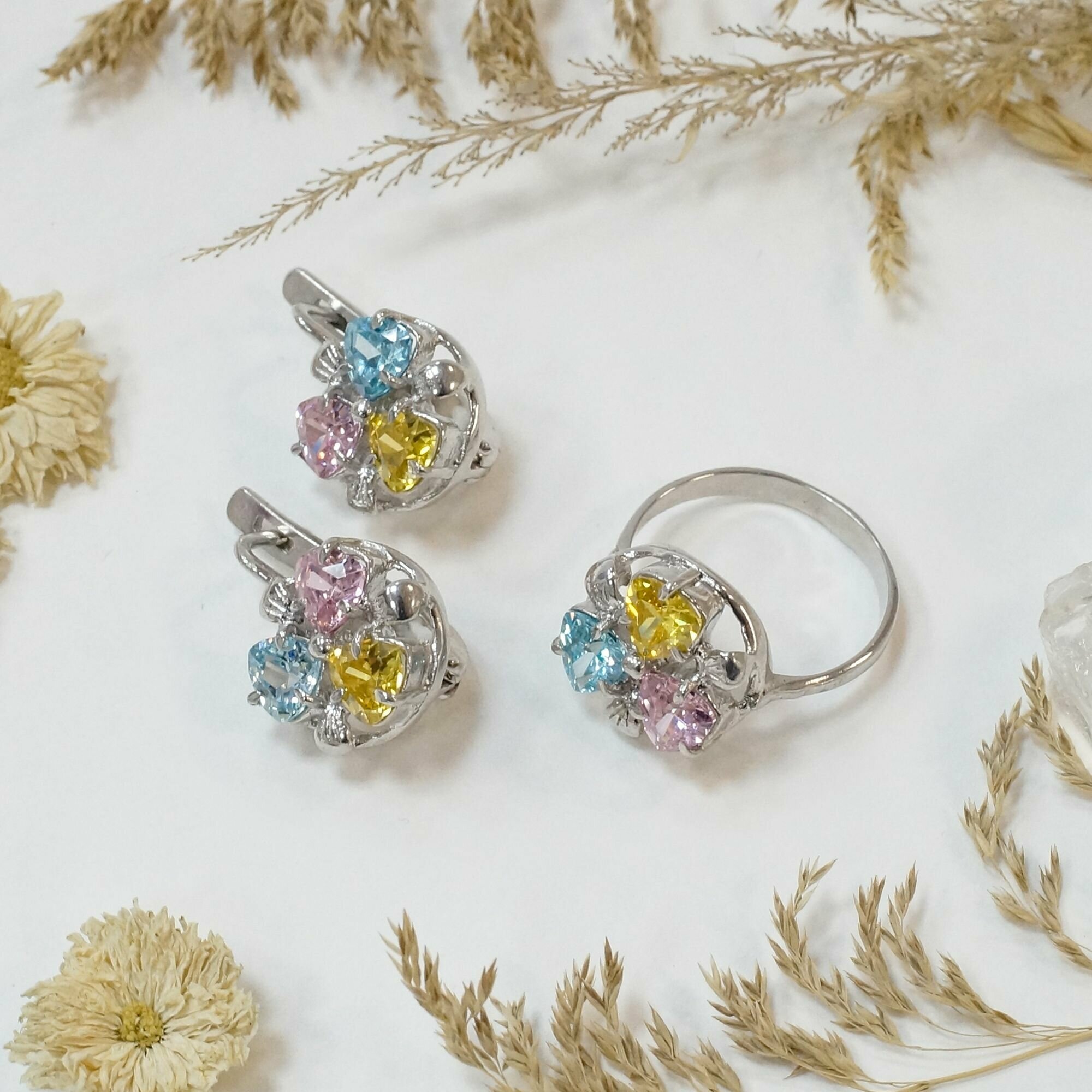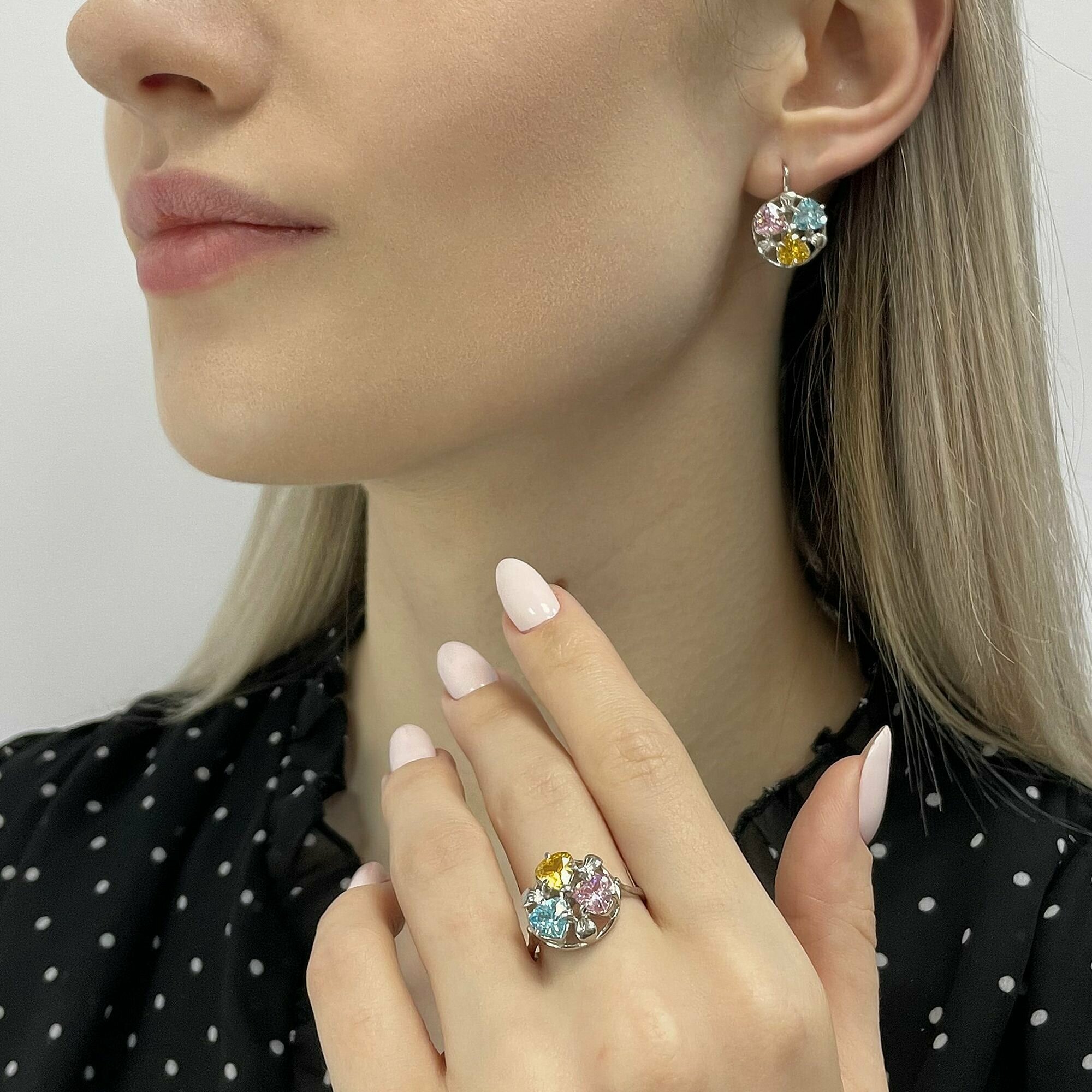 Сереброника, Комплект украшений серьги и кольцо с розовым, золотым и голубым фианитом из серебра 925 пробы интересное: