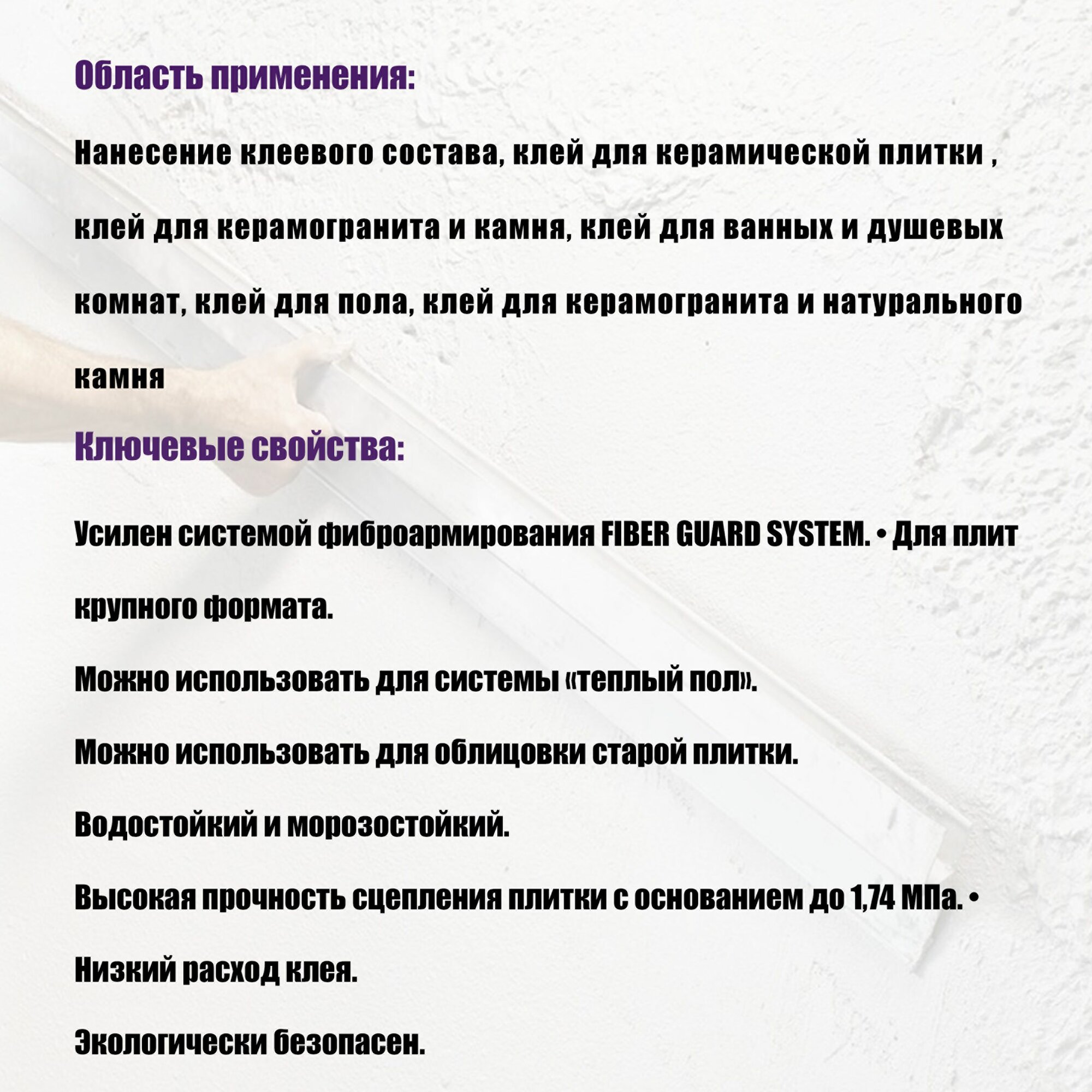 | Плюсы: | Очень высокая сила сцепления, долгое время жизни готового раствора - можно работать не торопясь, даже совсем медленно. |