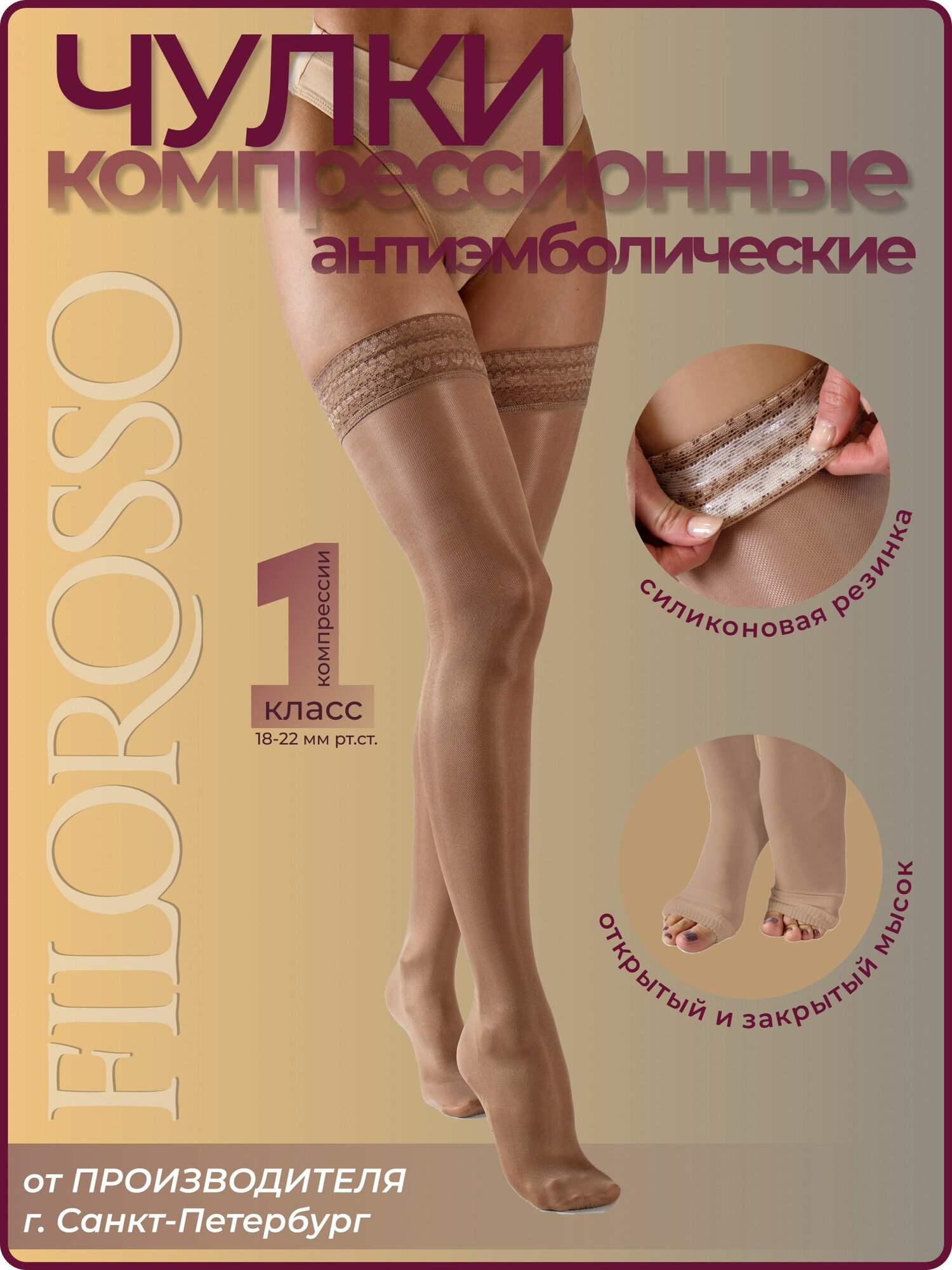Купить Чулки компрессионные Filorosso Госпитальные 50 den с кружевной резинкой, 1 класс компрессии, бежевый, размер 4