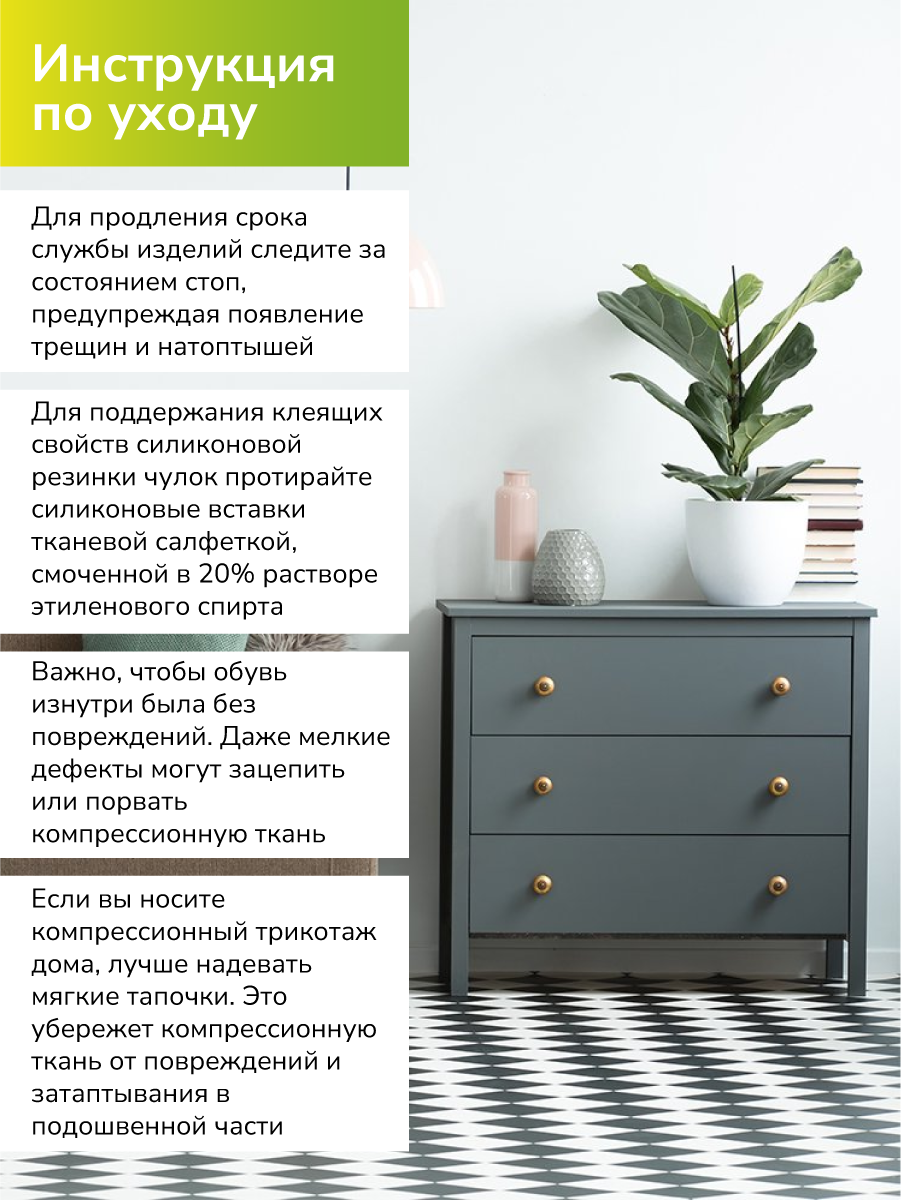 | Минусы: | Не соответствует размеру. Брала 5, но чулки в следу т по длине больше. По плотности также не соответствуют тем, которые всегда покупаю в специализированном магазине или на сайте Санитарка. |