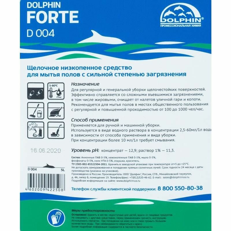 Средство для мытья пола Dolphin для машинной мойки, щелочное, концентрированное, от сильных загрязнений, Forte, 5 л
