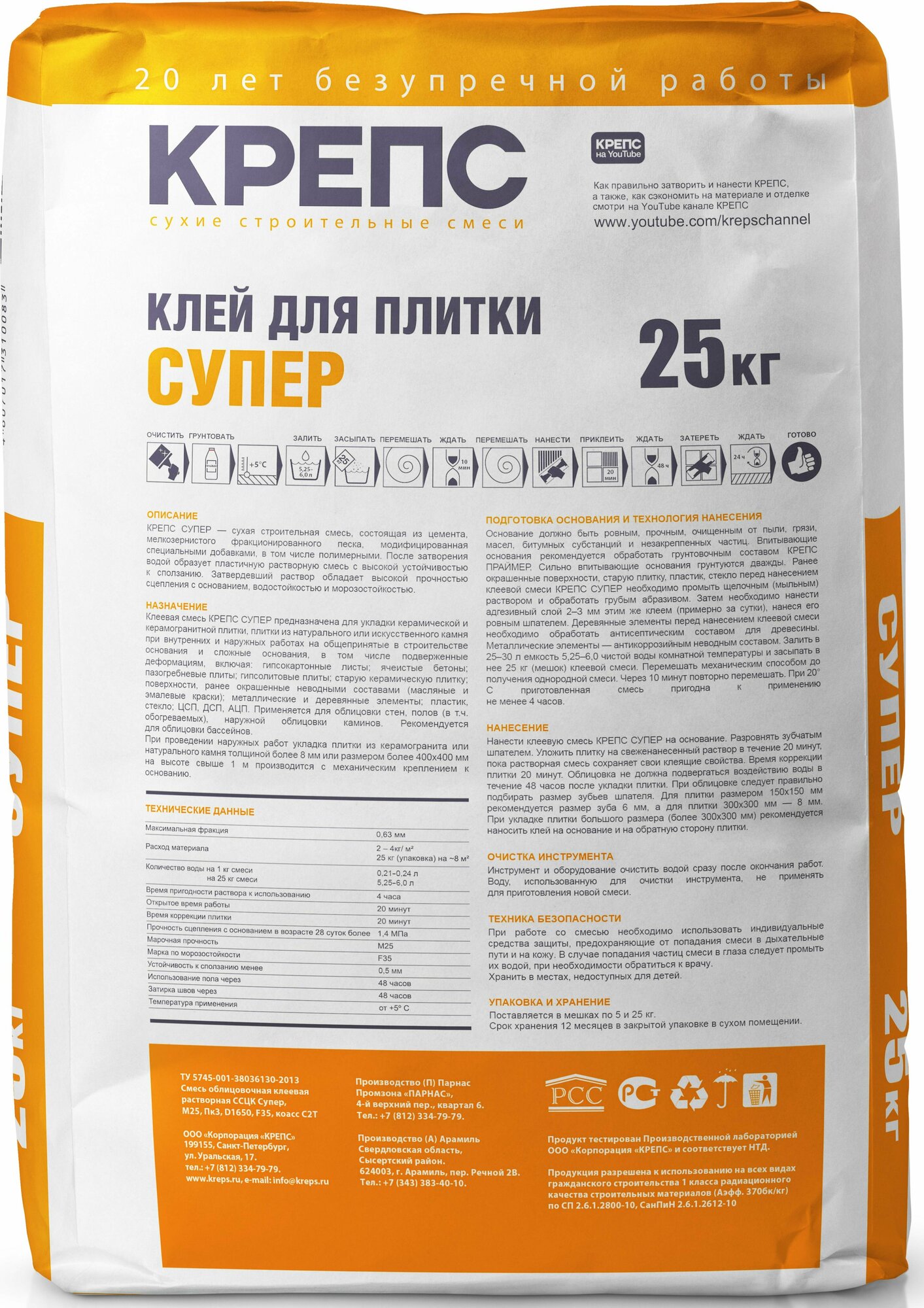Клей для плитки/ керамогранита/ камня Крепс Супер серый класс С2 Т 25 кг интересное:
