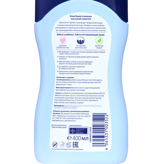 Мне очень нравится это средство и малышу тоже. После ванной становится спокойней и быстро засыпает. Я его рекомендую! Мягкое и деликатное средство для купания на растительной основе, стабилизирует естественную кислотную мантию кожи. Оно уменьшает покраснения и поддерживает ее природную защитную функцию. Содержит различные увлажняющие компоненты для оптимального ухода за нежной детской кожей. Содержит комплекс "БЮБХЕН-АКТИВНАЯ ЗАЩИТА КОЖИ", препятствующий избыточной потере влаге через кожу. Увлажняет кожу, благодаря натуральным активным компонентам ромашки, протеинам пшеницы, пантенолу и гелиотропину. Использовать с рождения. |
