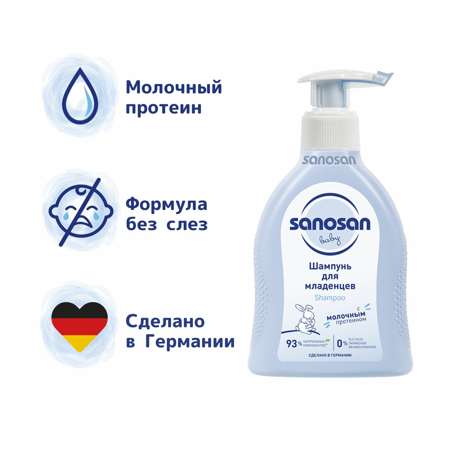 Купить Шампунь детский для младенцев и новорожденных без слез натуральный состав без парабенов Sanosan 200 мл. Средство детское для мытья и купания в ванной.