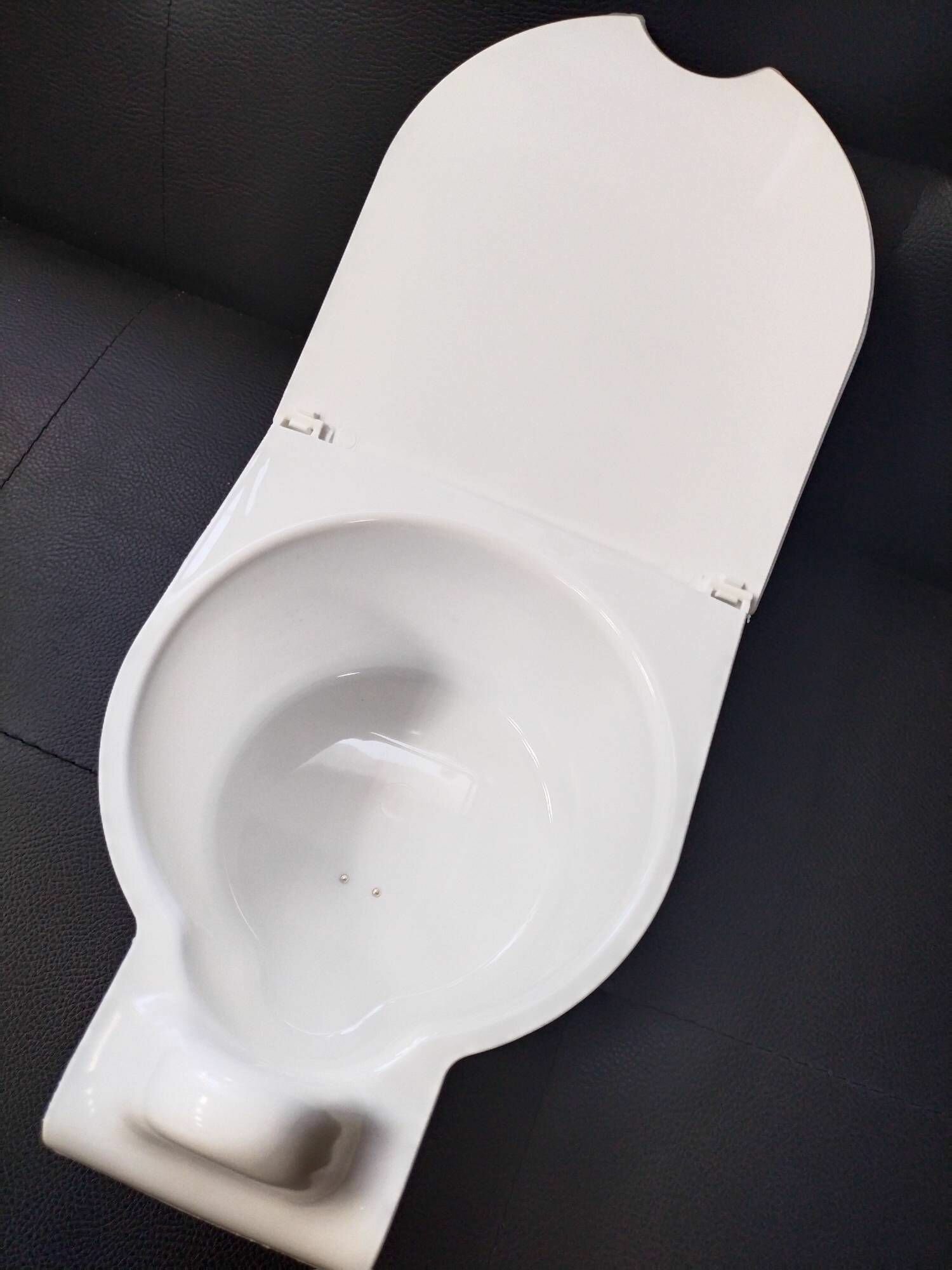 | Минусы: | Стул для совсем малышей. Теоретически предполагается, что приучать ребёнка нужно с года, но в него сын с трудом помещается, хотя малыш не пухлый. Передняя стенка, защищающая от брызг совсем не защищает, так как он сидит впритык к ней и она не очень высока. |