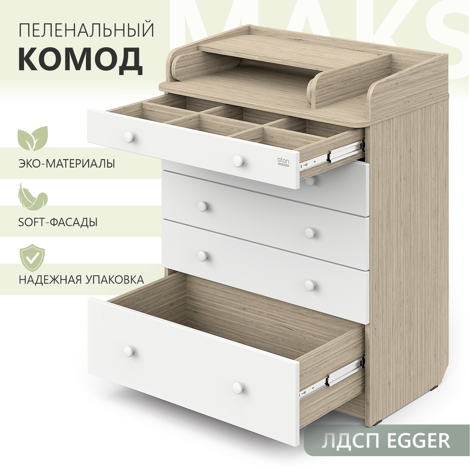 Комод пеленальный Атон MAKS ЛДСП 800/5 с органайзером, древесина белая-белый