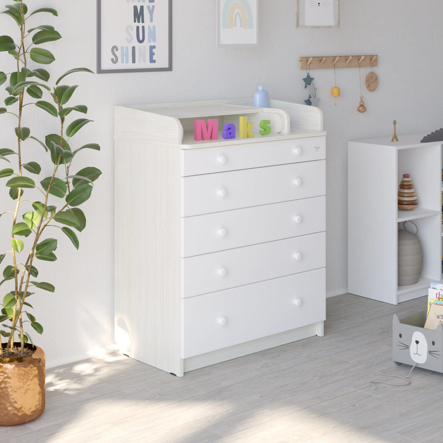 Пеленальный комод Maks, 5 ящиков, Древесина белая/белый софт